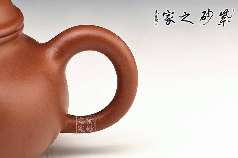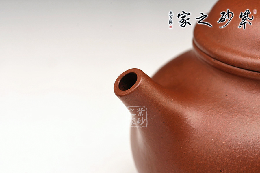 壺身圓潤飽滿,視覺上穩(wěn)重大度,在質(zhì)樸中見深厚,直流,流短而上翹,力度十足,出水爽凈有力,效果極佳。