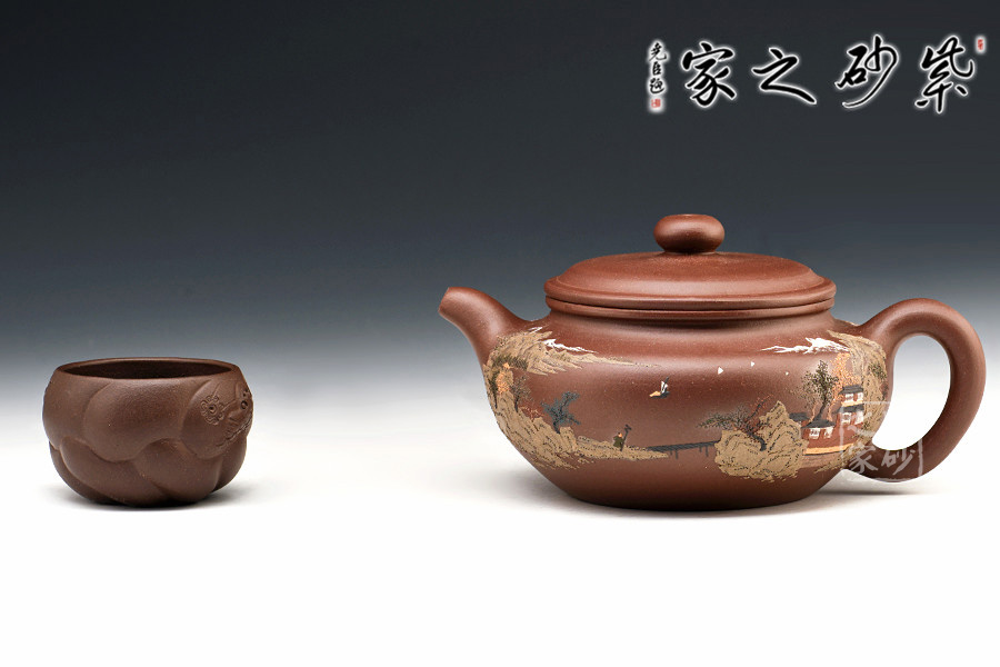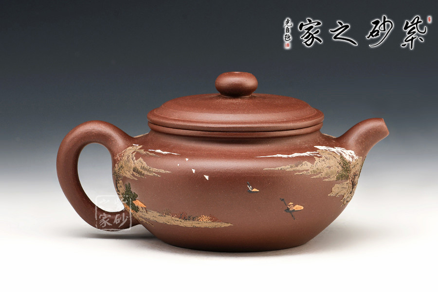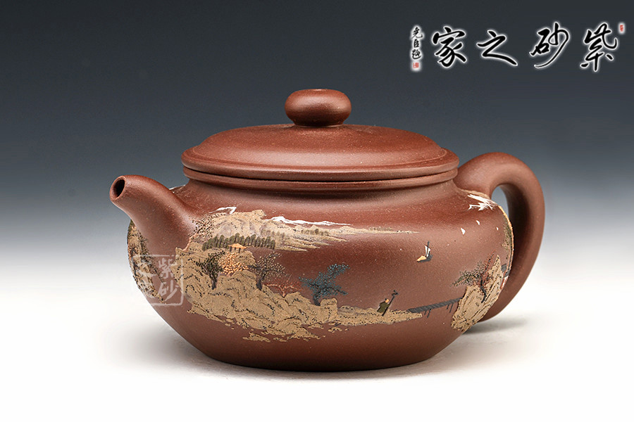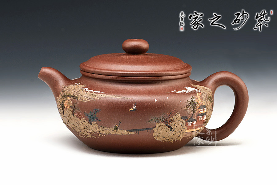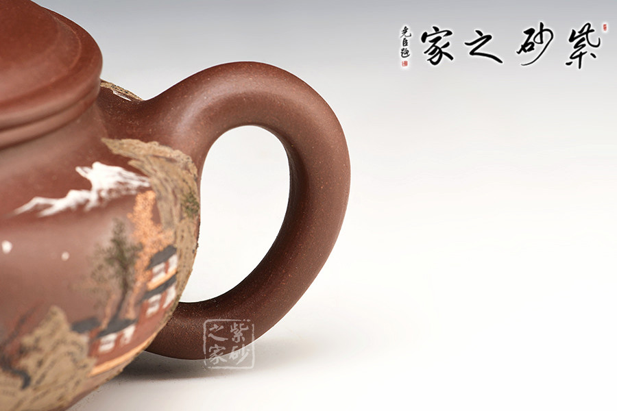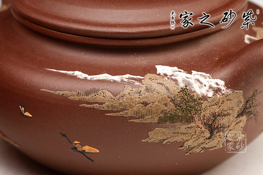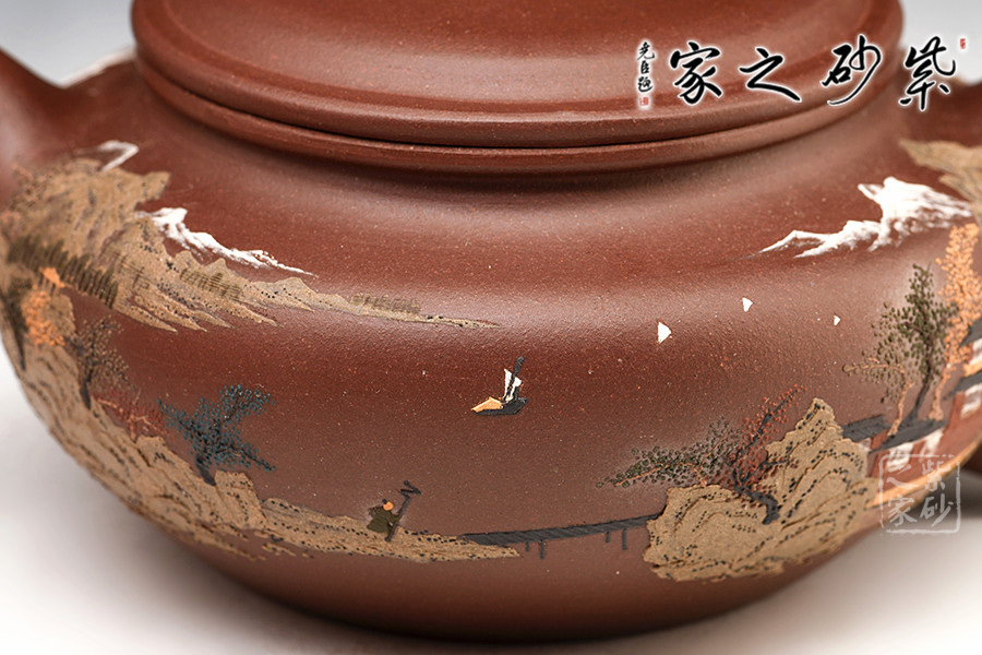 通體裝飾: 裝飾: 泥繪山水,意境悠遠 裝飾者:鮑剛明 裝飾內(nèi)容:
