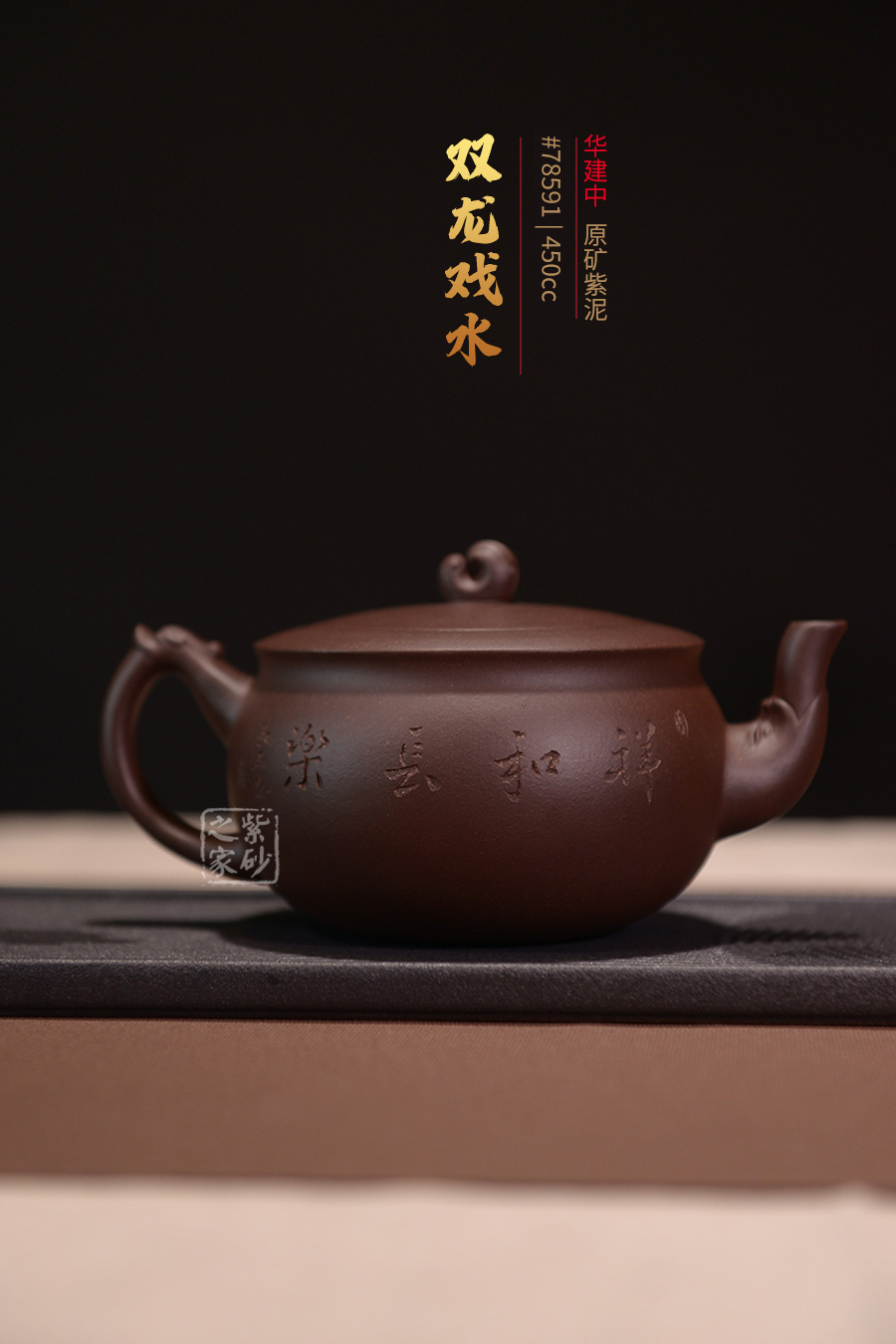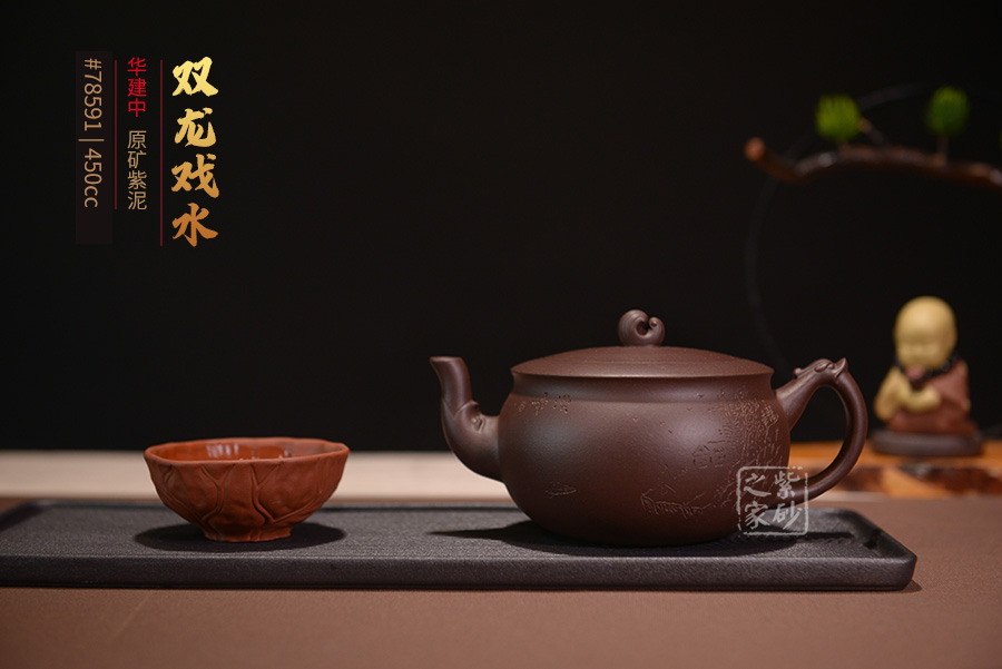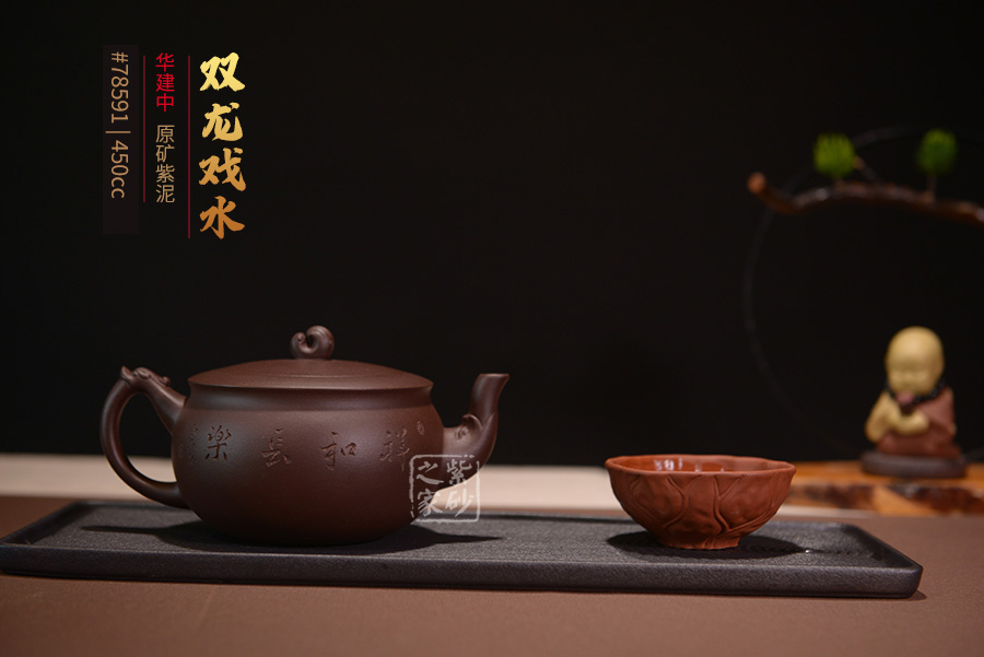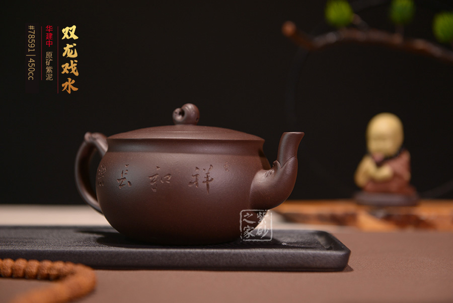 此款雙龍戲水壺便有著吉祥如意、前程無量的寓意。其壺身飽滿圓潤,壺身上篆刻泛舟山水畫及陶刻詩詞,蒼勁有力,令此壺在富貴權(quán)勢之中添了一些風(fēng)骨韻節(jié)。