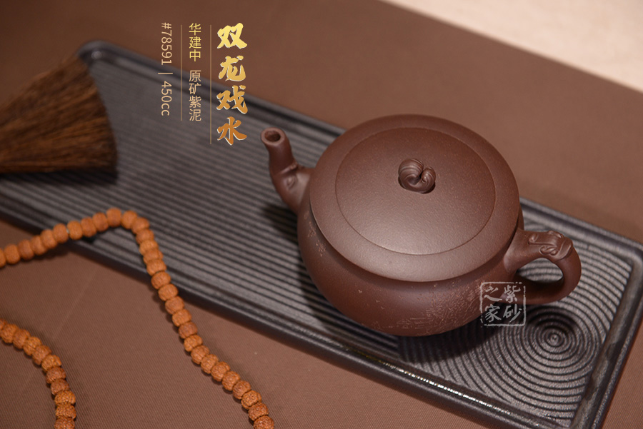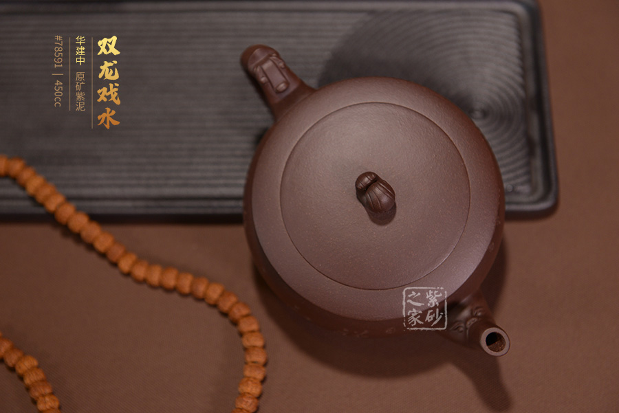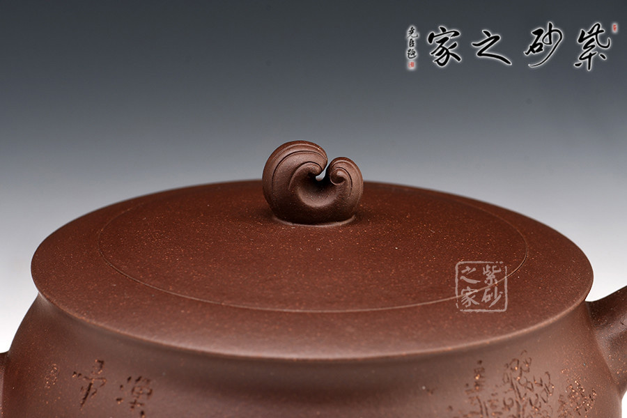壺嘴呈龍吐水之形,彎流大氣,胥出利落自然。嵌蓋平薄工整,中間稍鼓起,與壺身嚴絲合縫,氣密性極好。壺鈕為水浪,靈動十足,與流把兩龍組成“雙龍戲水”之態(tài),形式新穎,栩栩如生。