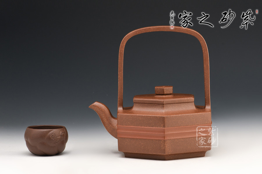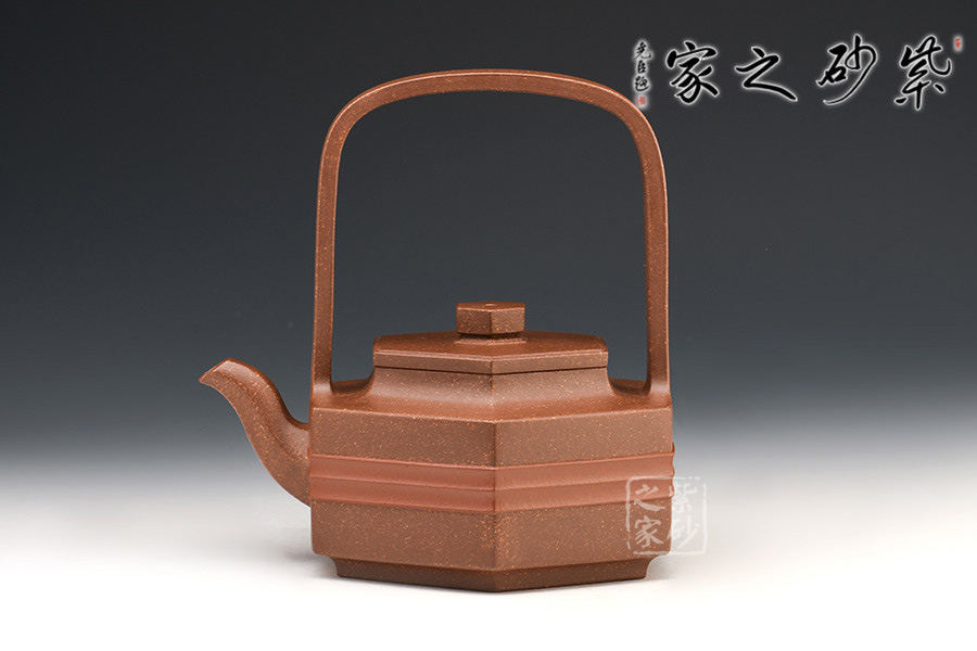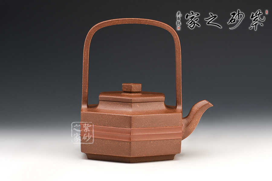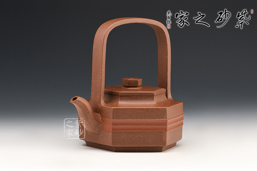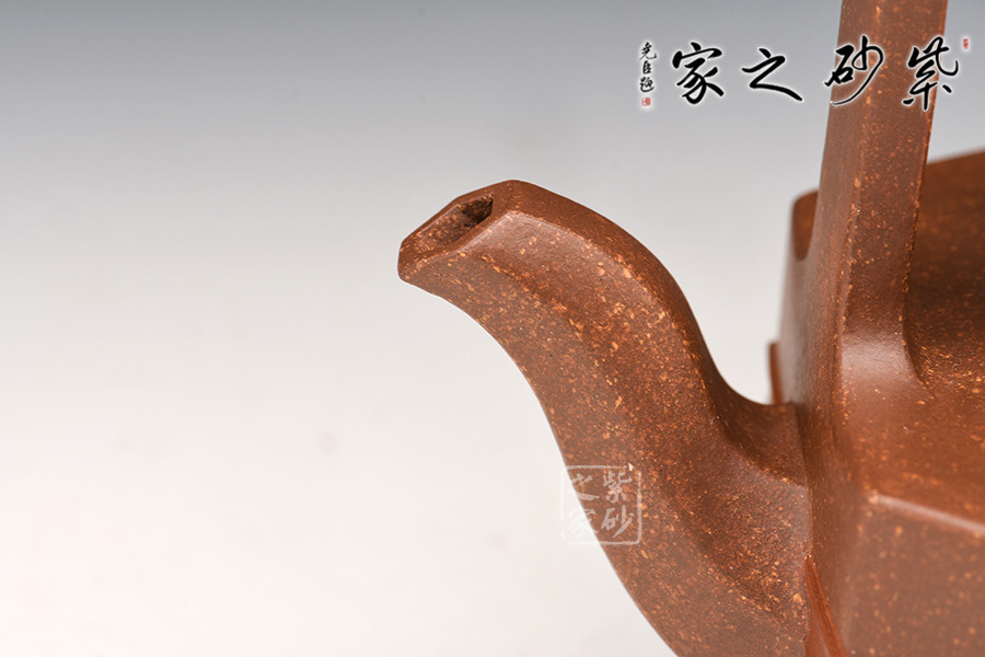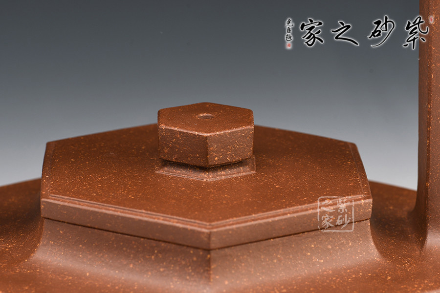 壺身、壺蓋、壺鈕、壺嘴皆為六方,線條流暢,棱角分明。三彎壺嘴,彎曲有致,出水爽利。門(mén)型寬提梁,拉伸空間,比例協(xié)調(diào),提捏方便舒適。與好友喝茶談心極其適合!