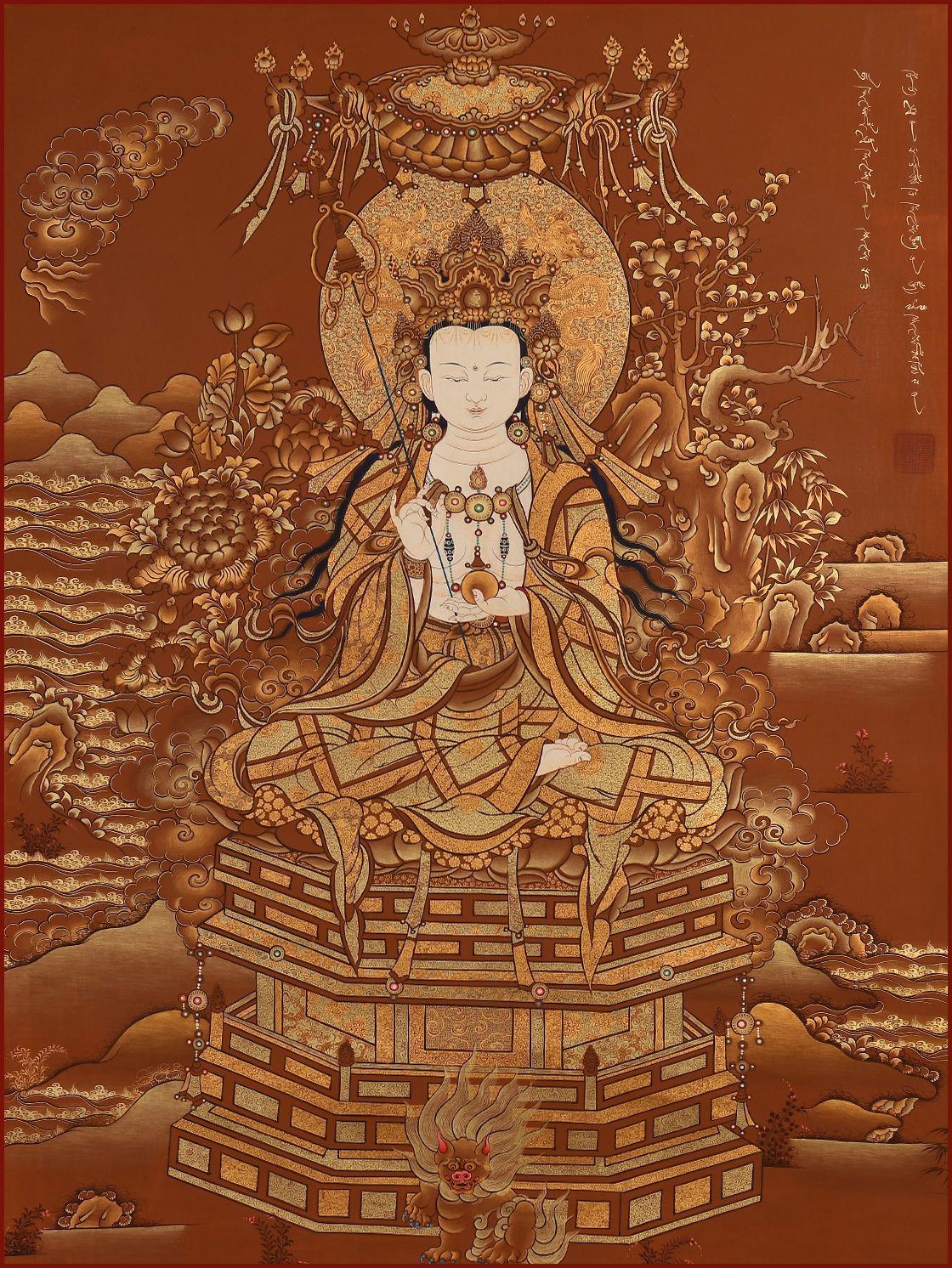 產地:熱貢 工藝:朱紅唐 創作年份:2018 題材:布置 繪制時間:5月 尺寸:*74*103cm 裝裱:無裱 材質:織面 使用場地:茶樓
