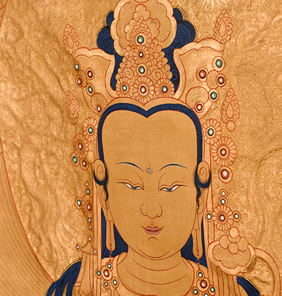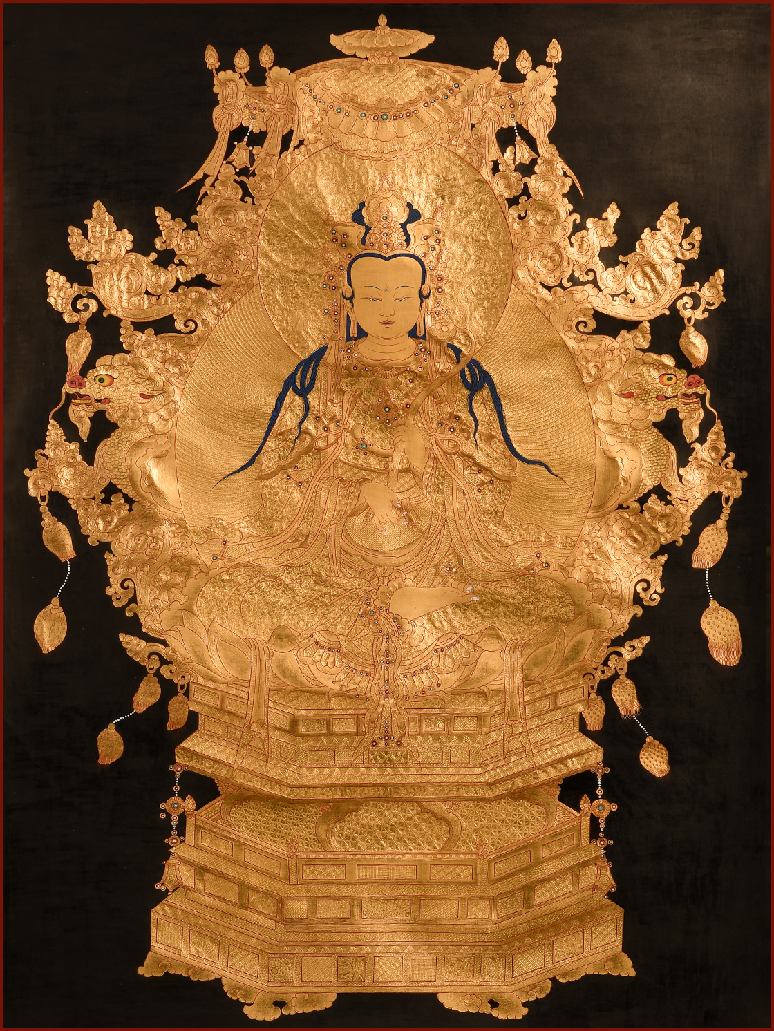產地:熱貢 工藝:金唐 創作年份:2018 題材:大勢至菩薩 繪制時間:5月 尺寸:*74*103cm 裝裱:無裱 材質:織面 使用場地:書房