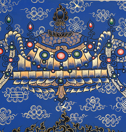 產地:熱貢 工藝:藍唐 創作年份:2018 題材:布置 繪制時間:5月 尺寸:*69*96cm 裝裱:無裱 材質:織面 使用場地:走廊