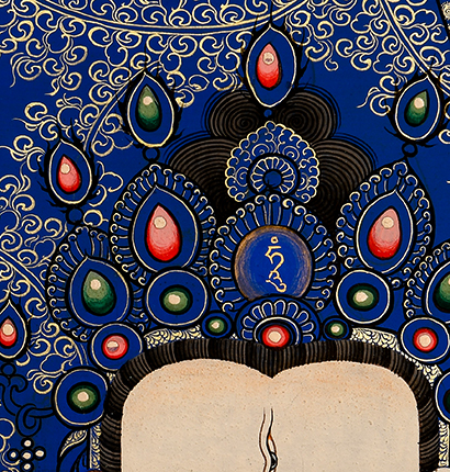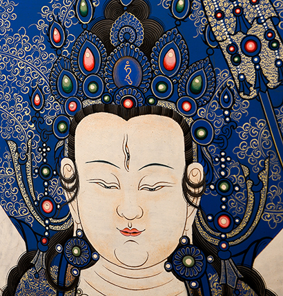 | 唐卡“師傅”開臉,筆路穩重流暢。體現完美天人相,可見佛菩薩慈眉善目,賦予唐卡畫像生的靈氣。 | 細節決定品質,點睛之筆不到位影響整體美觀,五官比例不協調,面目呆板,缺乏靈氣。 |