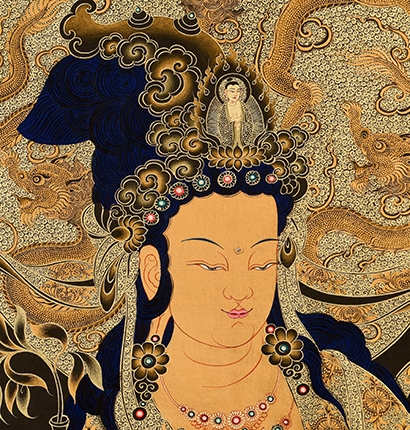 | 唐卡是歷史的瑰寶,現已被例入國家非物質文化遺產名錄,得到了高度的重視和保護。同時由于顏料的珍稀、繪制周期長、工藝復雜大大增強了其珍藏價值。一幅好的作品可遇不可求,近年來唐卡已成為收藏界炙手可熱的藏品。 | 唐卡的形式便于攜帶,其內容體現了藏傳佛教的莊重、神圣、華貴,被稱為“移動的佛像”。同時也是修行者積累善業,追尋心靈的平靜與安寧的一個過程。 | 唐卡的內容包羅萬象,它以圖像的方式承載著藏族文化精髓,是藏族智慧的結晶,廣泛傳播了藏地的文化、歷史和宗教理論。 | 唐卡絢麗的色彩、流暢的線條、嚴謹的結構,都充滿著濃郁的高原和游牧民族風情,無疑是難得的藝術珍品。值得一提的是唐卡繪制顏料全部為天然礦物顏料,畫面效果艷麗,可以保存千年而不變色。 |
