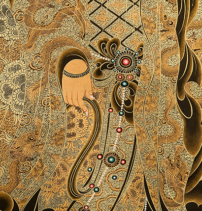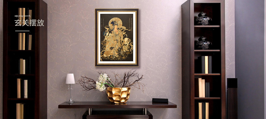 產地:熱貢 工藝:黑金 創作年份:2018 題材:布置 繪制時間:5月 尺寸:*70*104cm 裝裱:無裱 材質:織面 使用場地:茶樓