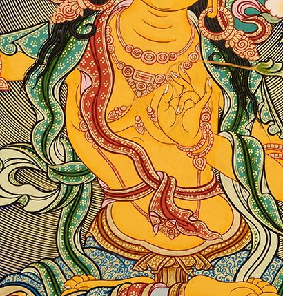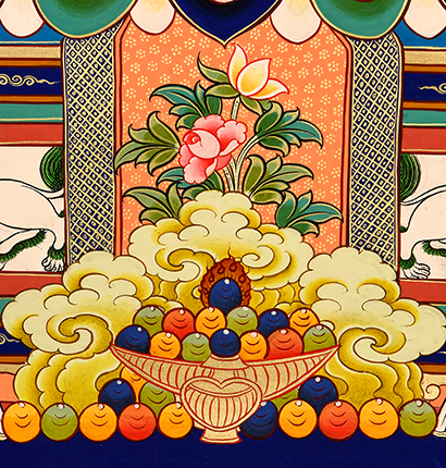 | 唐卡是歷史的瑰寶,現已被例入國家非物質文化遺產名錄,得到了高度的重視和保護。同時由于顏料的珍稀、繪制周期長、工藝復雜大大增強了其珍藏價值。一幅好的作品可遇不可求,近年來唐卡已成為收藏界炙手可熱的藏品。 | 唐卡的形式便于攜帶,其內容體現了藏傳佛教的莊重、神圣、華貴,被稱為“移動的佛像”。同時也是修行者積累善業,追尋心靈的平靜與安寧的一個過程。 | 唐卡的內容包羅萬象,它以圖像的方式承載著藏族文化精髓,是藏族智慧的結晶,廣泛傳播了藏地的文化、歷史和宗教理論。 | 唐卡絢麗的色彩、流暢的線條、嚴謹的結構,都充滿著濃郁的高原和游牧民族風情,無疑是難得的藝術珍品。值得一提的是唐卡繪制顏料全部為天然礦物顏料,畫面效果艷麗,可以保存千年而不變色。 |