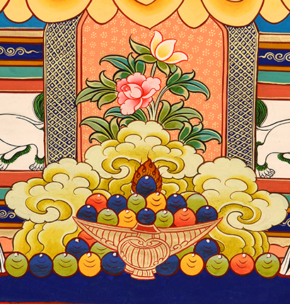 | 唐卡是歷史的瑰寶,現已被例入國家非物質文化遺產名錄,得到了高度的重視和保護。同時由于顏料的珍稀、繪制周期長、工藝復雜大大增強了其珍藏價值。一幅好的作品可遇不可求,近年來唐卡已成為收藏界炙手可熱的藏品。 | 唐卡的形式便于攜帶,其內容體現了藏傳佛教的莊重、神圣、華貴,被稱為“移動的佛像”。同時也是修行者積累善業,追尋心靈的平靜與安寧的一個過程。 | 唐卡的內容包羅萬象,它以圖像的方式承載著藏族文化精髓,是藏族智慧的結晶,廣泛傳播了藏地的文化、歷史和宗教理論。 | 唐卡絢麗的色彩、流暢的線條、嚴謹的結構,都充滿著濃郁的高原和游牧民族風情,無疑是難得的藝術珍品。值得一提的是唐卡繪制顏料全部為天然礦物顏料,畫面效果艷麗,可以保存千年而不變色。 |