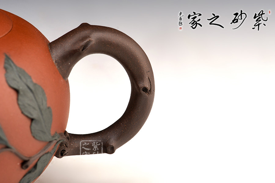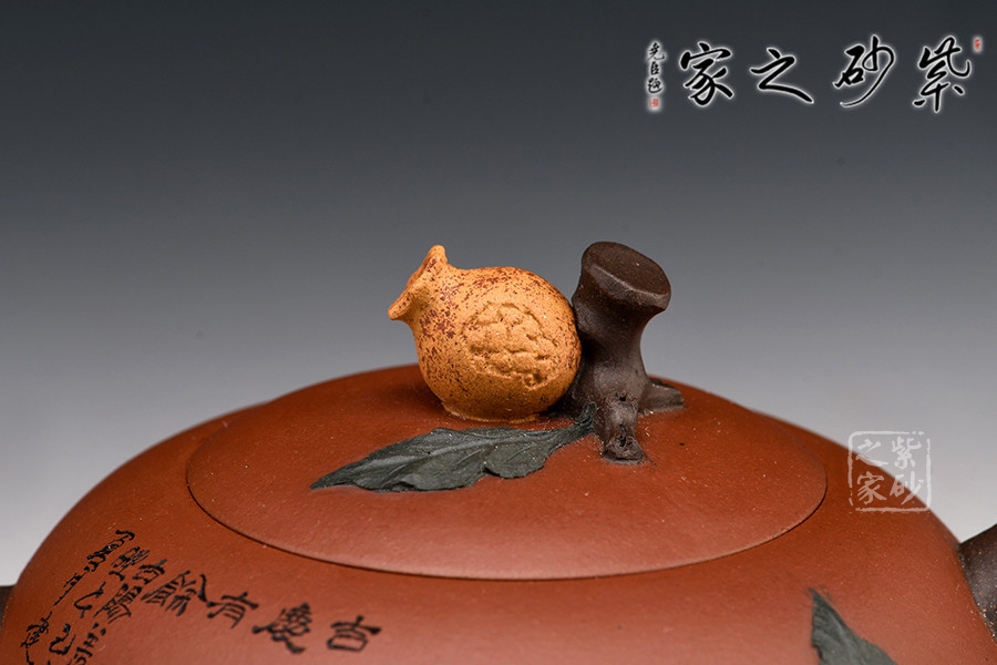此為紫砂壺仿生器型,壺身為石榴形,嵌蓋,隨形口沿,蓋鈕塑以一小石榴。枝節(jié)作流柄,蜿蜒靈動(dòng),壺腹一處裸露石榴果粒,形態(tài)逼真,石榴葉片盤貼通體各處,造型生動(dòng),做工精湛,頗見(jiàn)巧思。