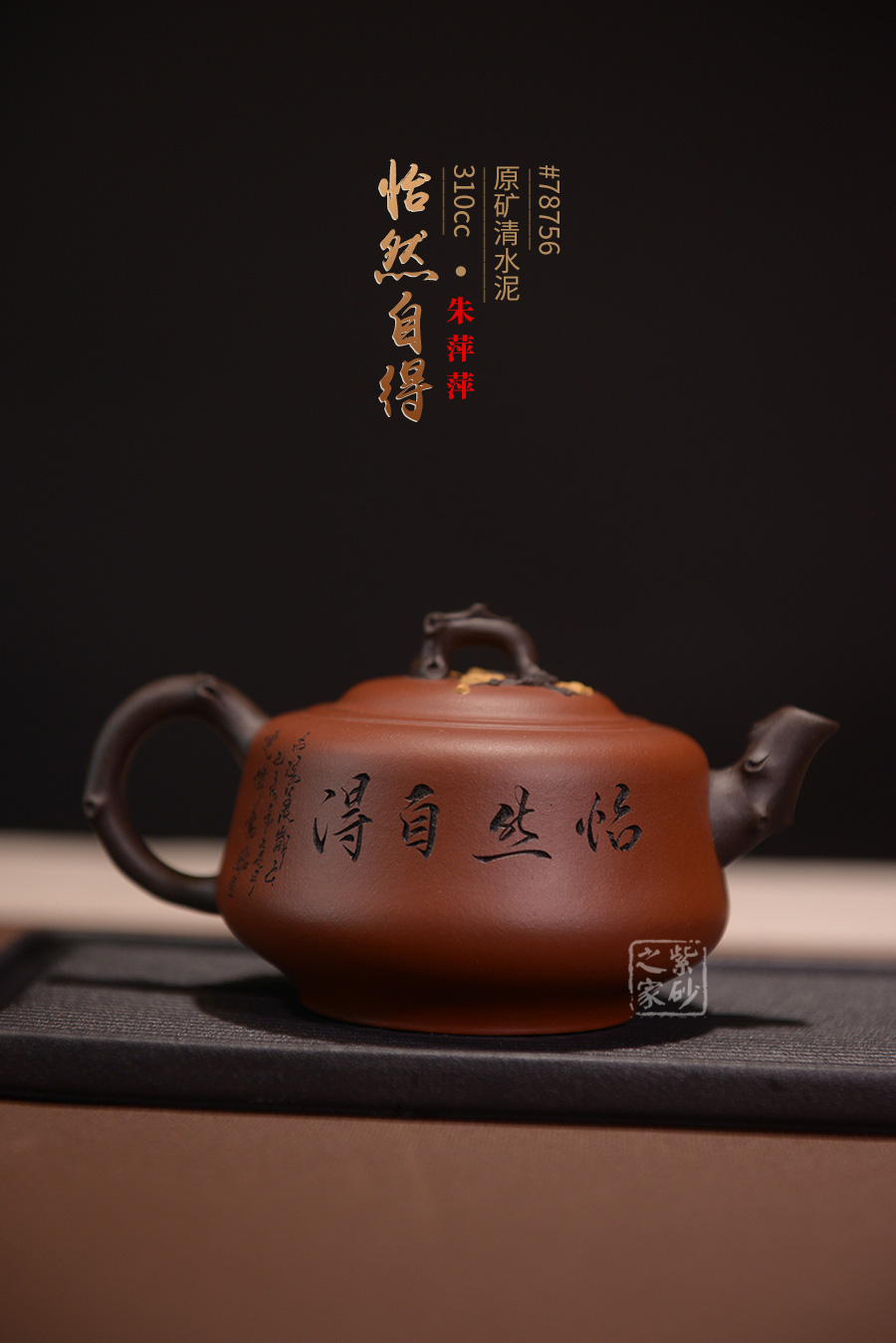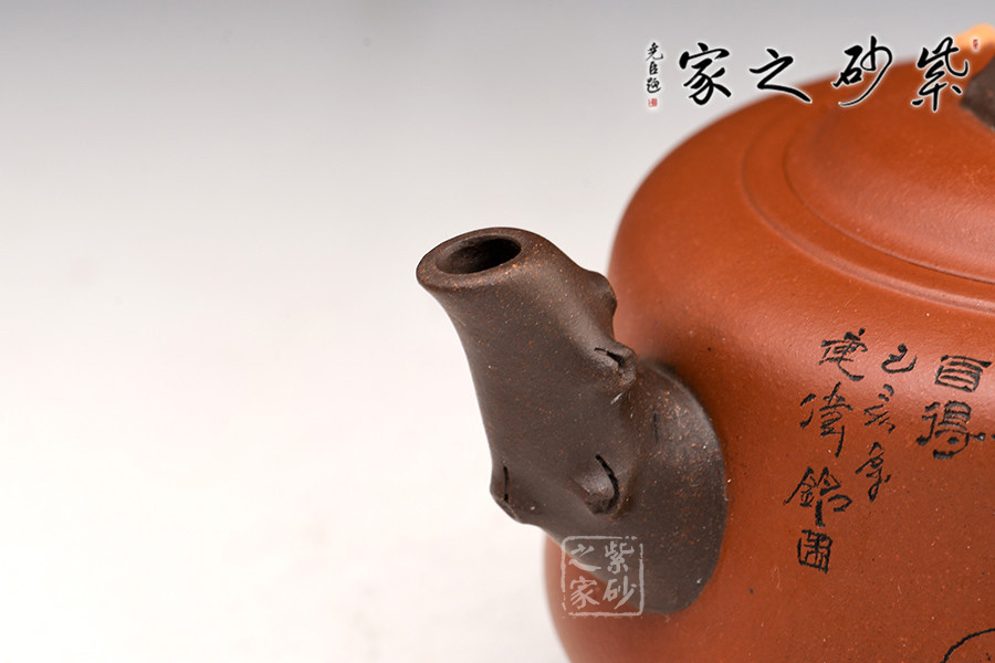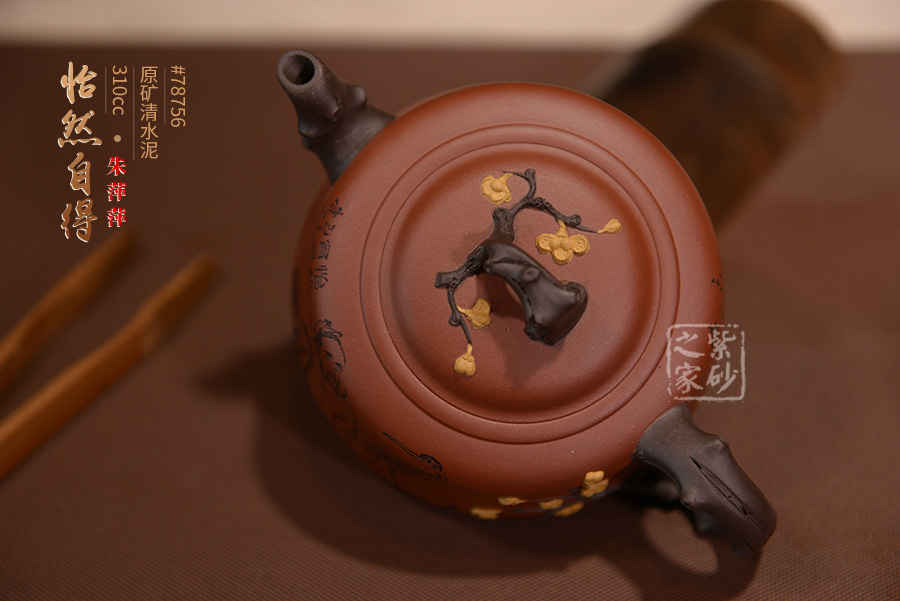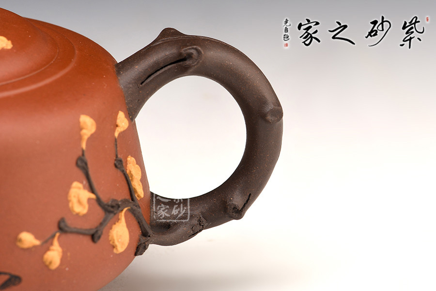 這款“怡然自得”,造型新穎美觀,善用雙色泥工藝,壺嘴、壺把以樹枝形狀展現(xiàn),彎曲有度,與壺身上點(diǎn)綴的黃花裝飾呼應(yīng),意趣橫生。壓蓋之上的壺鈕別致獨(dú)特,呈拱形狀,增添了此壺的氣勢。