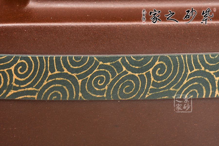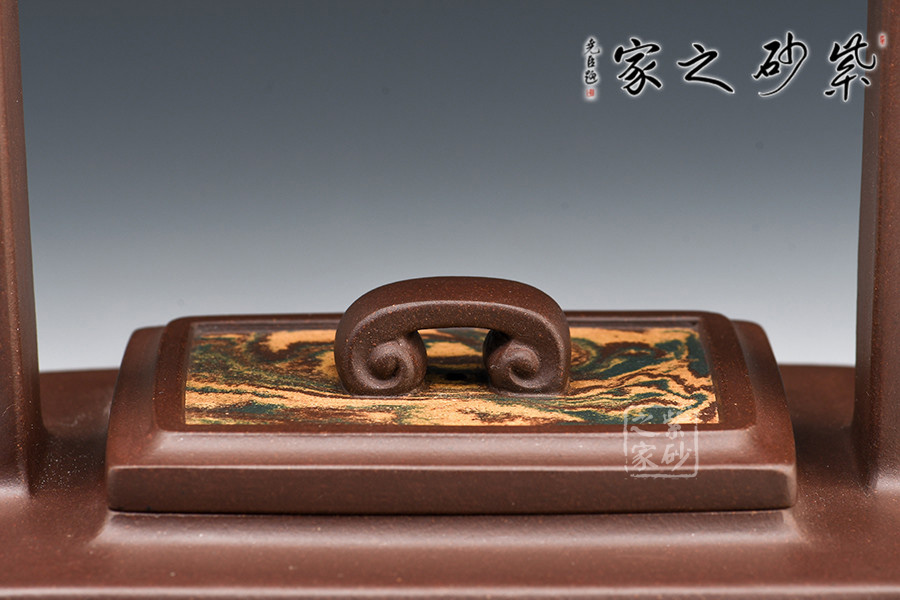 此作壺身云梯見方,三彎流,四方足,如意橋鈕。蓋面、提梁把及束腰皆以難度頗高的絞泥工藝裝飾,色彩對(duì)比強(qiáng)烈,融合得體,方中求變,讓人感悟到它的節(jié)奏和韻律美。