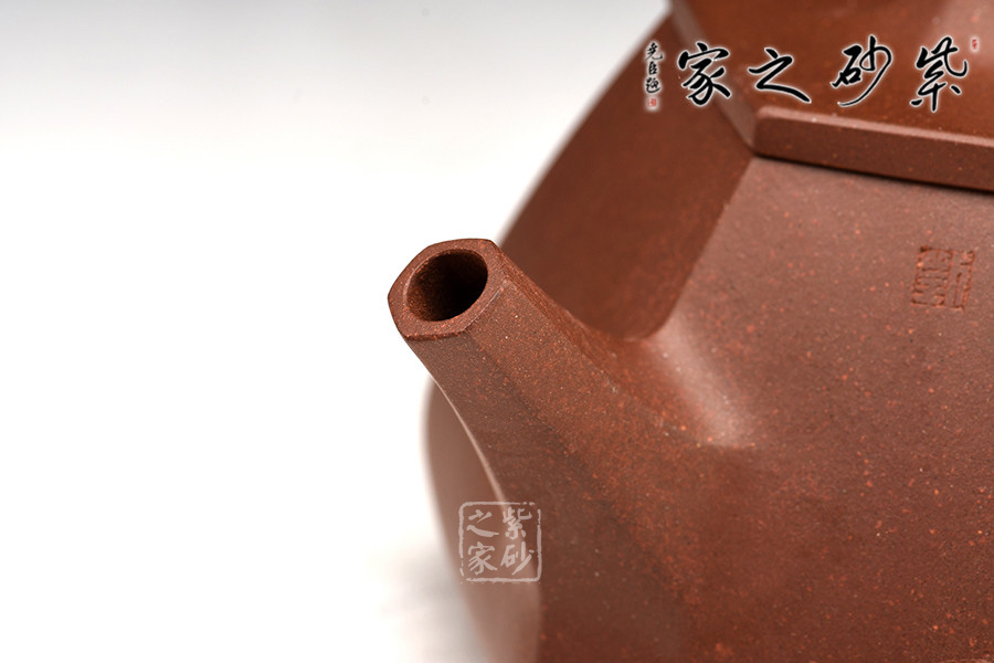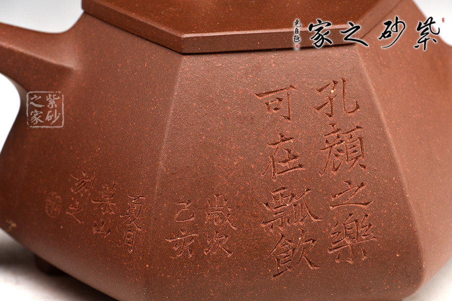 此作于石瓢中添加六方造型,乃是于樸實(shí)沉凝中添加工整挺拔,壺身六根線條切割了石瓢敦實(shí)自在的壺面,線條似直似曲,線面結(jié)合渾然一體,在轉(zhuǎn)折變化之間增加強(qiáng)硬的造型線條,提升了整體器物的風(fēng)度格局,于靜默無(wú)言間卓爾不群!
