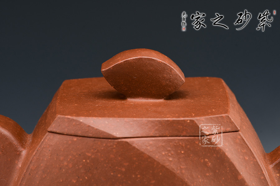 整壺上下斂中間豐,身為四方形,卻方中混圓。壺身之上線條波轉,似風吹折痕,自然流動。壺鈕呈一葉片的形狀,立于壓蓋之上,古味濃厚,又實用別致。