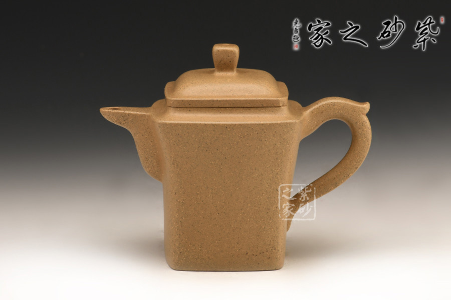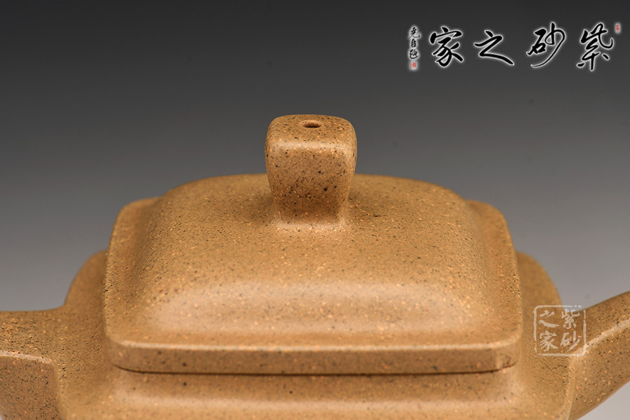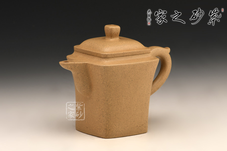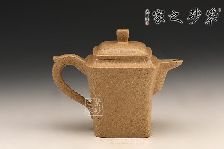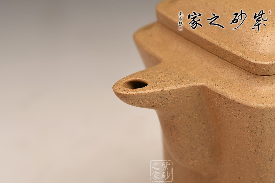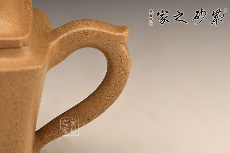 作品作高身四方體,但是所有塊面轉(zhuǎn)折都略顯收斂,將直線與弧線巧妙結(jié)合,使之方中帶圓,創(chuàng)造了優(yōu)雅而悅目的造型。壺嘴、流把設(shè)計別致,藝術(shù)美感凸顯,整器比例得當(dāng),氣韻秀雅,段泥作料,非良工不能作此。