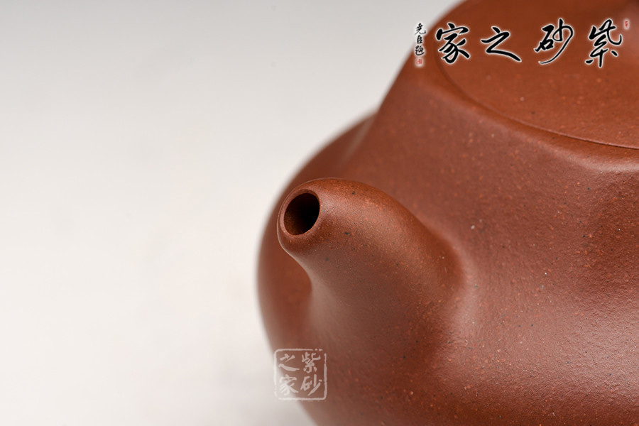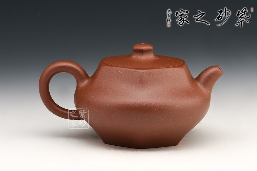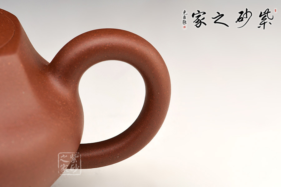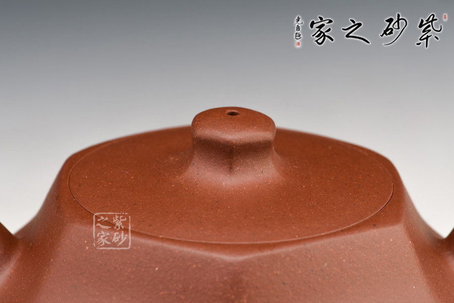 壺體設計新穎,雅而不俗,富有生活氣息。此作兼具方器的規(guī)整和圓器的圓融,方中寓圓,設計優(yōu)美,各處弧度布局自然,鼓腹、六方嵌蓋、柱形鈕,加上短彎的流嘴和耳形把,整器簡約而不簡單。