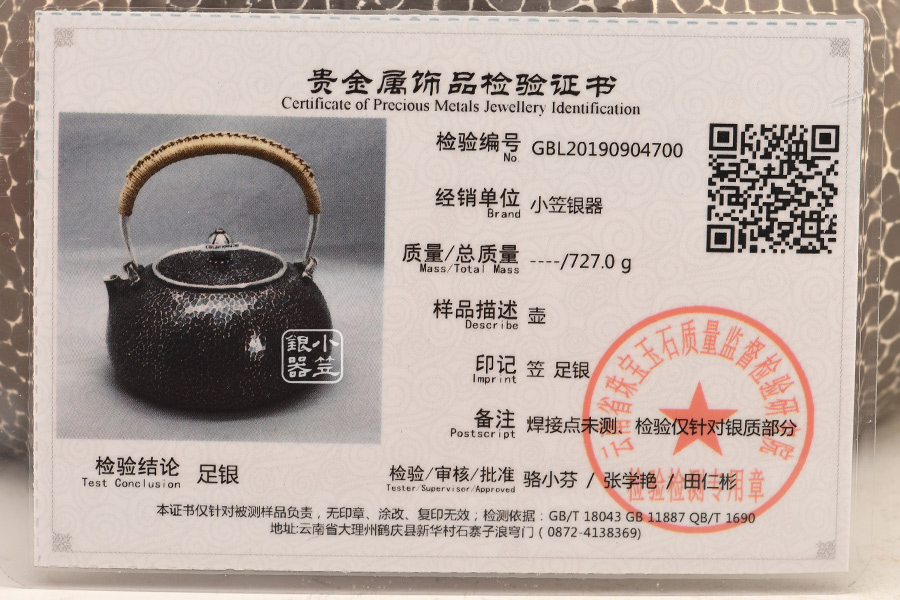 產地:中國 堂口:小笠銀器 材質:純銀 工藝:一張打 容量:1400cc 重量:725g