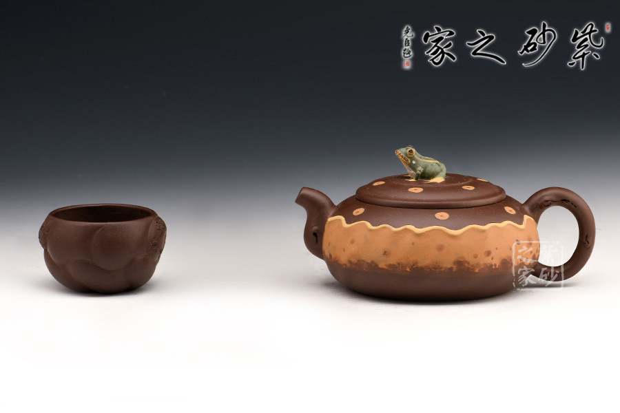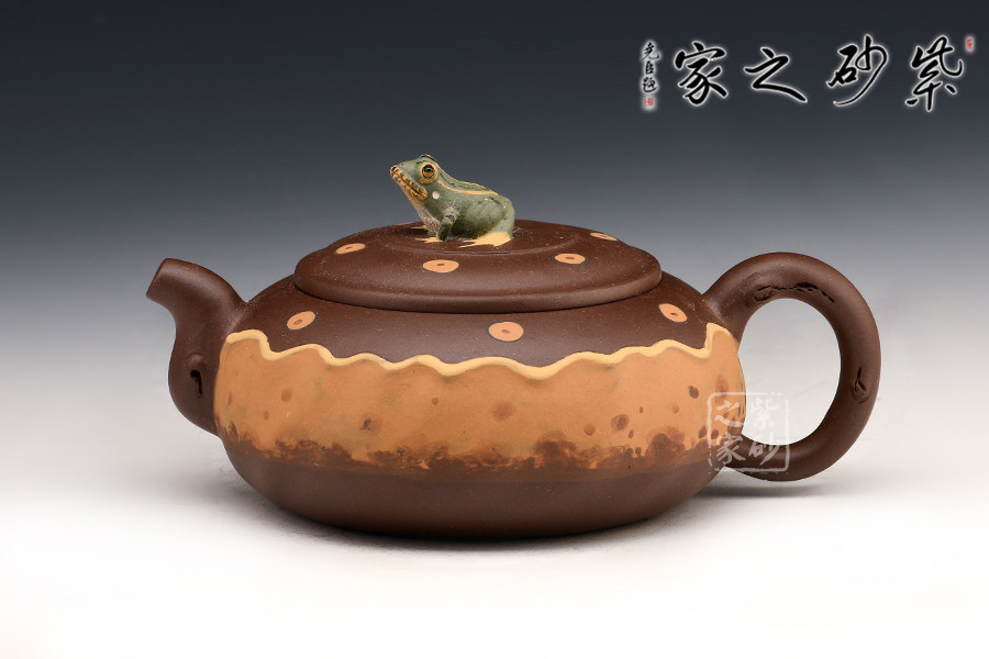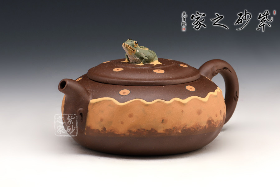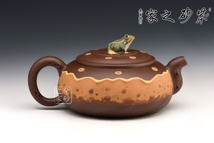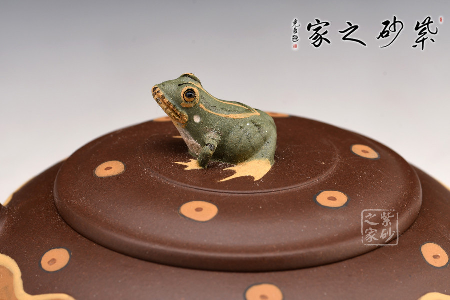 此壺造型逼真,壺體似一蓮蓬,如詩畫一般。運用蓮子、蓮藕、青蛙等素材,給我們營造了一副荷塘月色實景圖的同時,也給我們對荷塘美景產(chǎn)生了無限想象,可謂亦壺亦景,展現(xiàn)了藝術(shù)的美感與自然生趣。