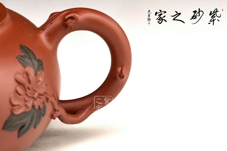 此壺用色到位,造型新穎,花團(tuán)錦簇,其型其色其神皆妙不可言也。流把與壺鈕以樹枝之素與牡丹之艷形成鮮明對比,又不顯唐突,卻在彼此之間形成默契,使得壺風(fēng)高雅而不拒人千里之外。