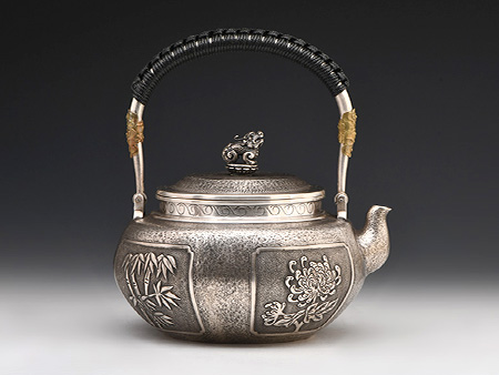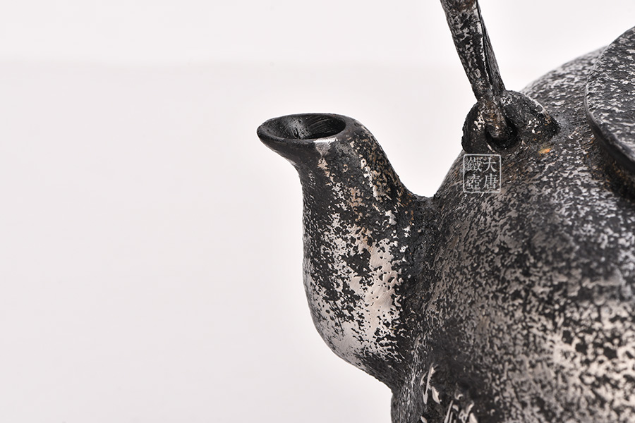 荒井工房的鐵瓶除了在鑄造工藝上有嚴格的規(guī)范和體系,在鐵瓶裝飾技術(shù)上也頗有建樹。除了傳統(tǒng)的印刻技術(shù)外,荒井工房還掌握了非常出色的金銀鑲嵌技藝,尤其以大片的鏨刻銀片最為出眾,這在山形當(dāng)?shù)靥每谥歇殬湟粠谩?/p>