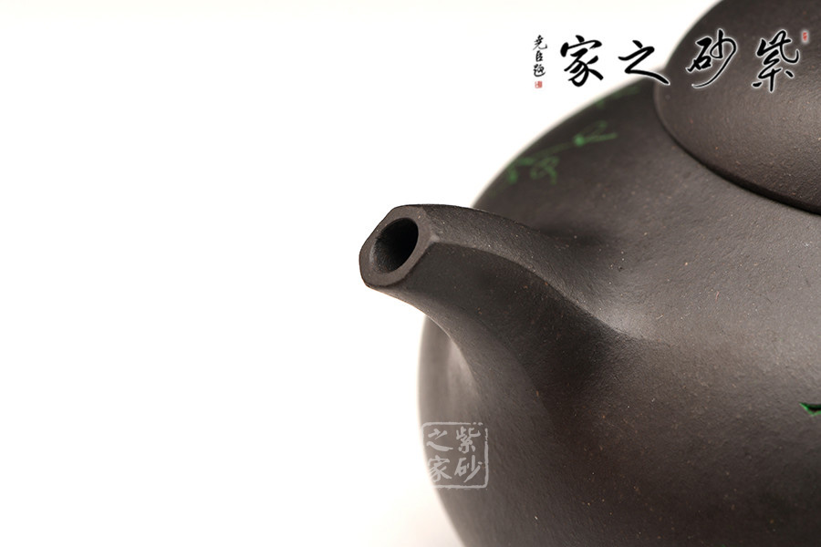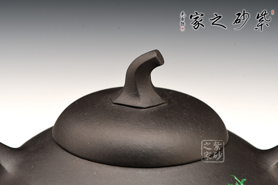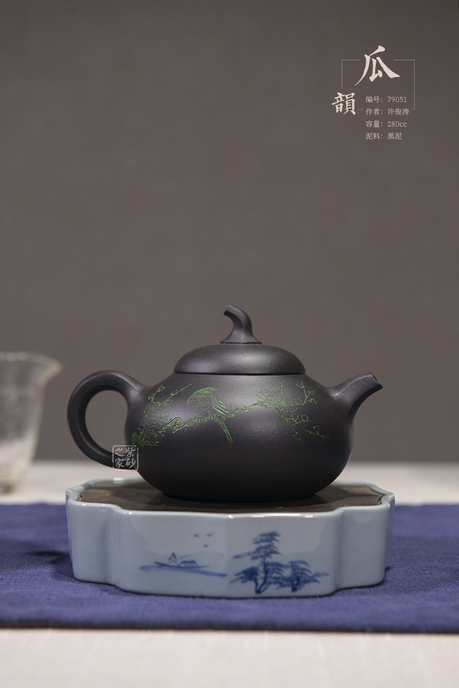 壺身呈茄瓜式,身姿挺拔,黑泥燒制,手感細膩。鼓腹飽滿,截蓋微鼓,藤蔓作鈕。短彎流,環(huán)形把,方圓結合,以壺身中線對稱呼應。整體質樸有致,形體豐滿,線條流暢,周正完美。