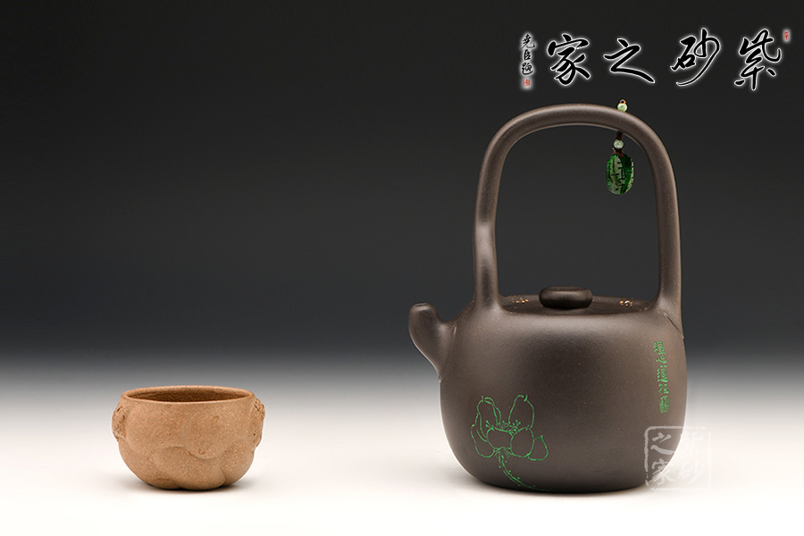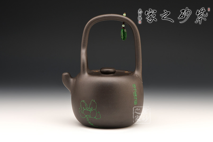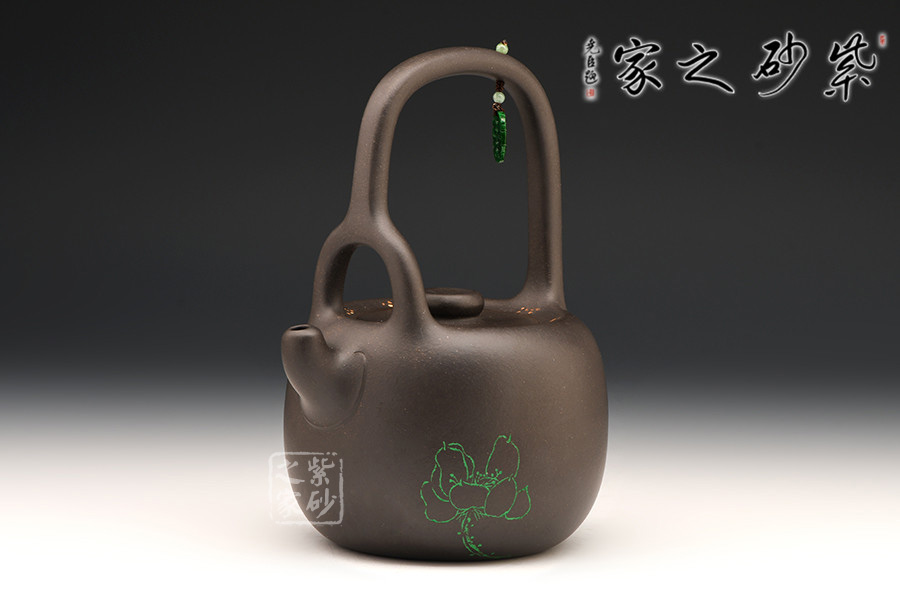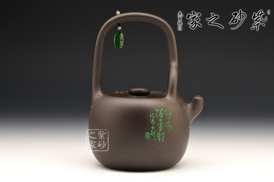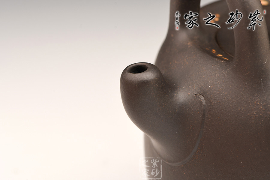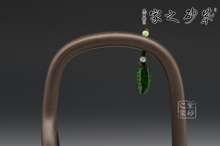 這把壺器型沉穩(wěn)自在,線條流暢自然,工藝精巧,古樸的造型,沉穩(wěn)內(nèi)斂的氣質(zhì),給人一種憨厚自然之感。大肚圓融的壺身,線條飽腹,獨以養(yǎng)韻。配以短流厚重的壺嘴以及肥端的壺把,更添一份憨然可掬。在提梁上搭配以玉石顯得提梁高挑別致,把玩時多了一分欣賞的樂趣,觀之感受中國傳統(tǒng)珠飾的神韻,更為此壺增添了古韻雅氣。