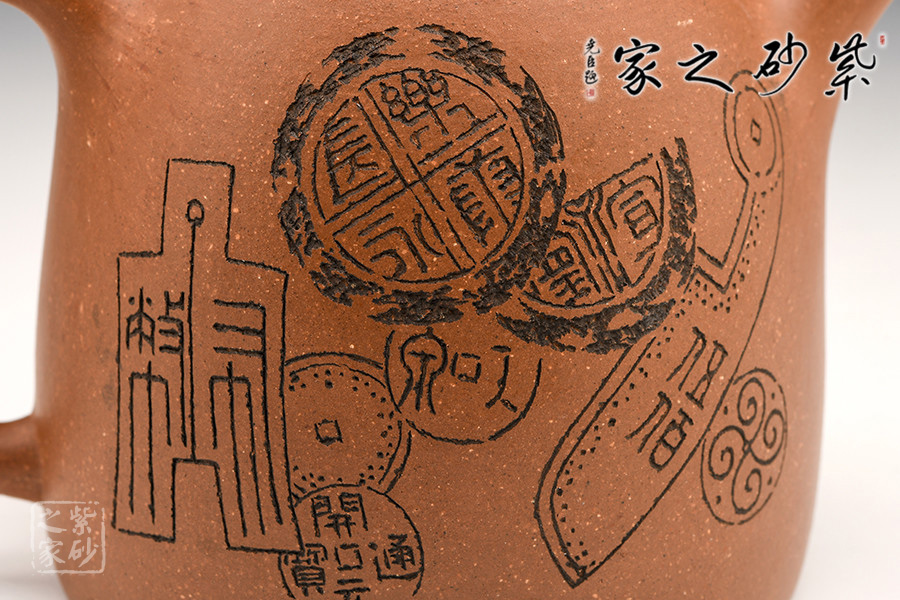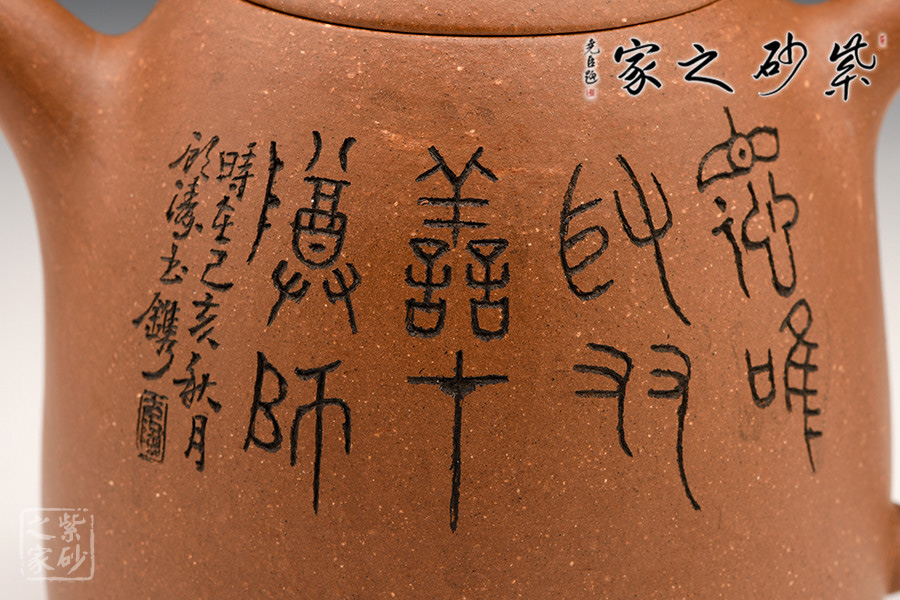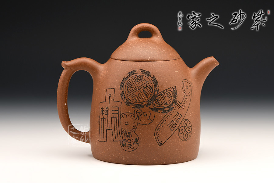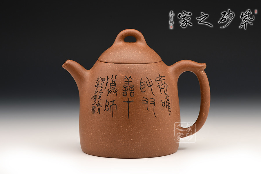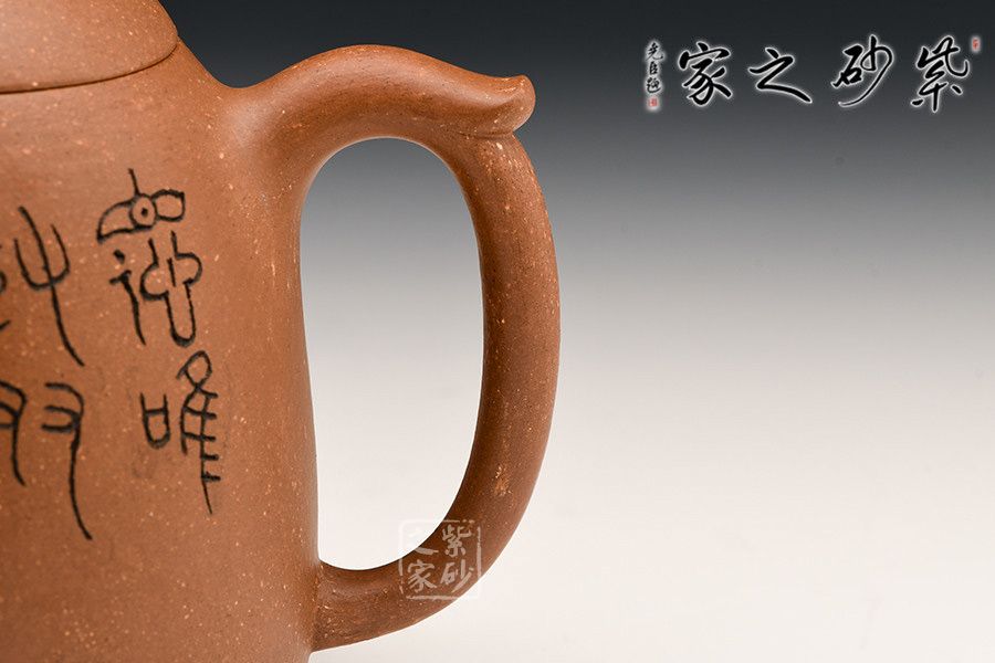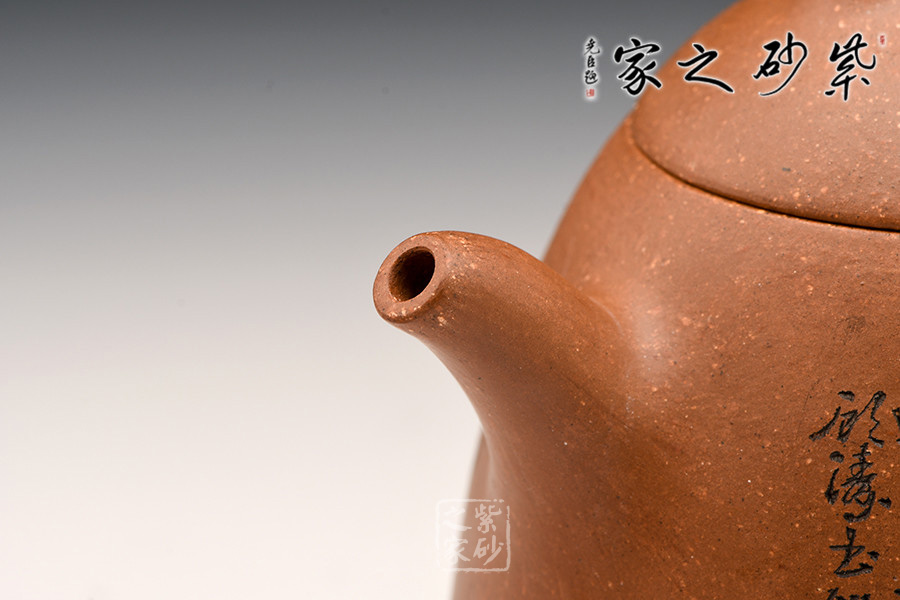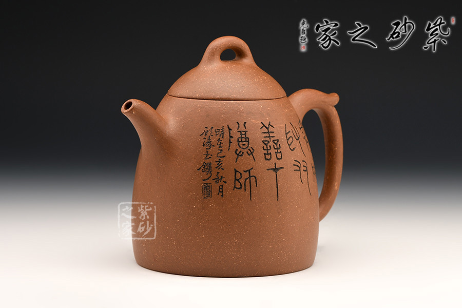 此壺形似秤砣,以秦始皇統(tǒng)一度量衡時所用稱之權(quán)為形,而得名《秦權(quán)壺》。壺形似柱上部收斂,橋形鈕順著鐘形蓋面弧度拱起。短流向上微曲,力感十足。環(huán)耳形把手,半圓形截蓋,棕紅色澤溫和中正,形制樸素敦厚,態(tài)體光潤優(yōu)美,線條流暢而規(guī)則,氣格古樸,穩(wěn)重沉著。