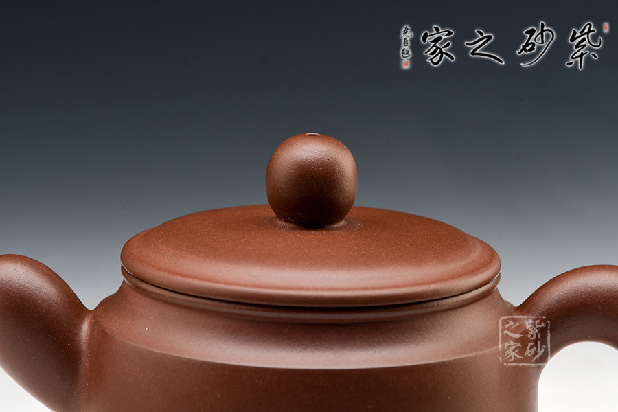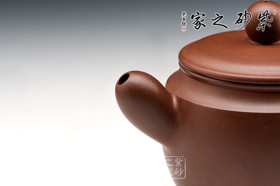 此壺以正宗原礦紫泥制作而成,色澤古樸,造型工整,形制大方。壓蓋出唇,銜接緊密,蓋上作一圓珠鈕,比例碩大,視覺效果甚佳。短粗嘴和圈把呼應(yīng)整器風(fēng)格,結(jié)合更為和諧雅致。