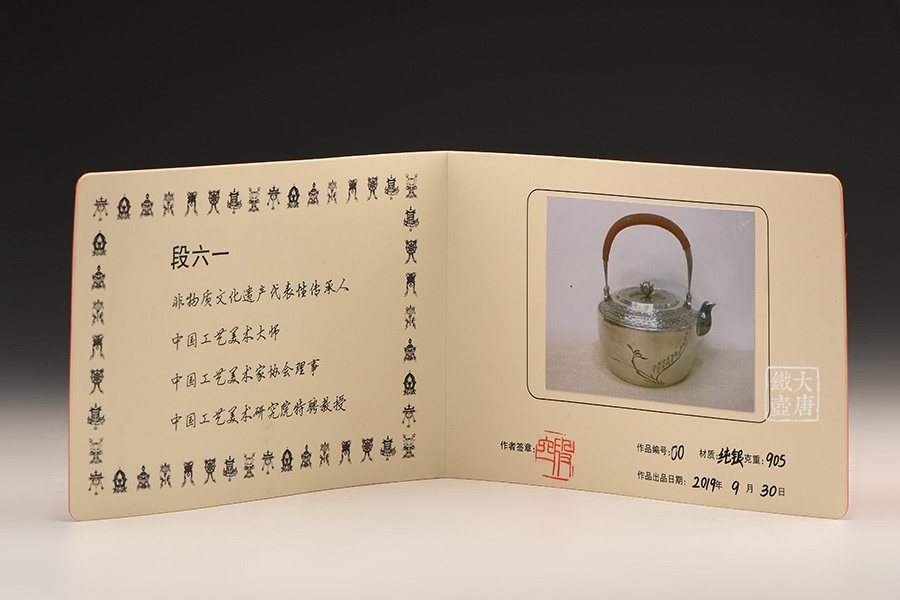 產(chǎn)地:中國(guó) 堂口:段六一 材質(zhì):純銀 工藝:一張打 容量:1220cc 重量:906g
