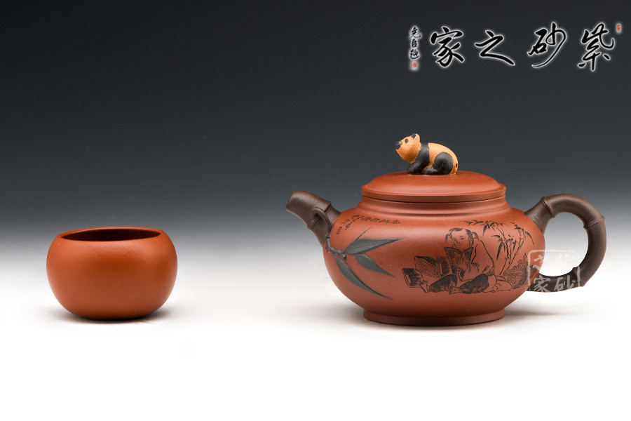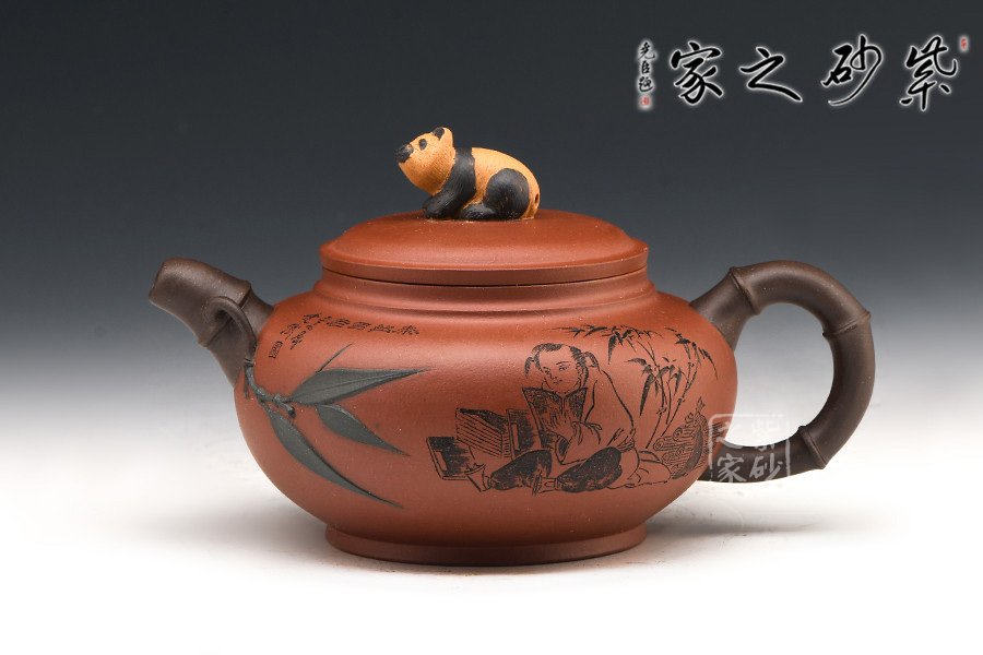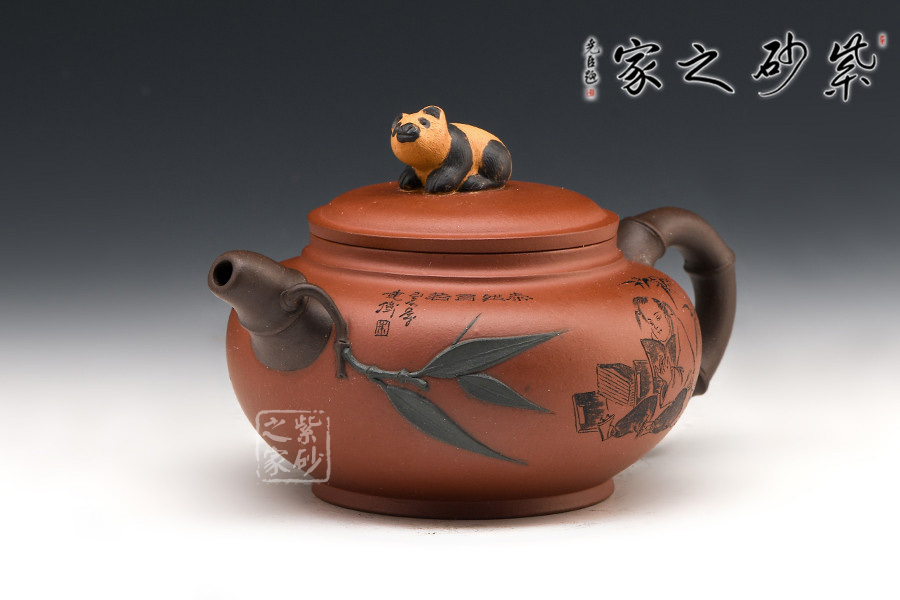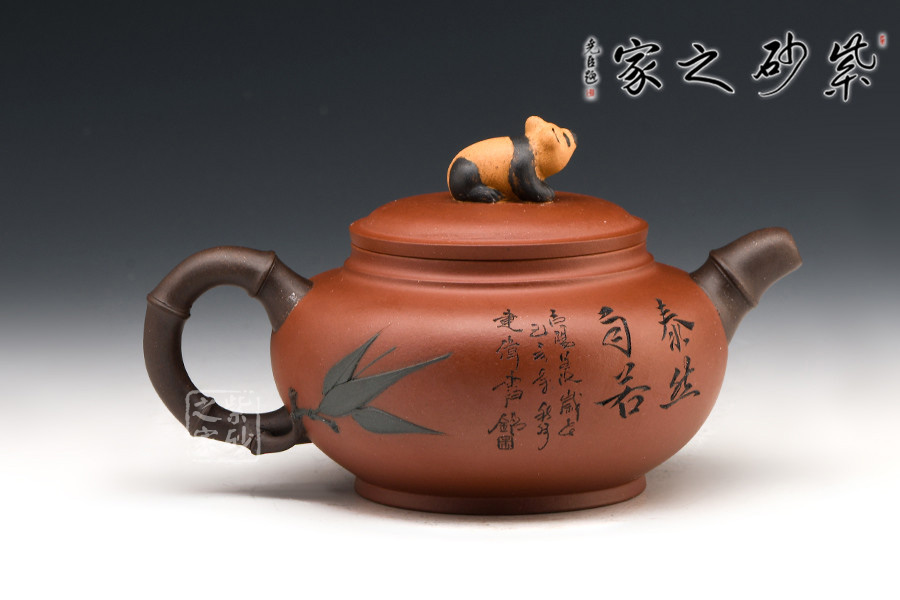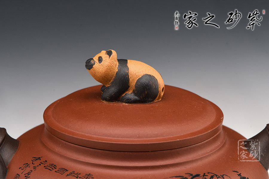 此壺由雙色泥料制成,壺身渾圓飽滿,壺流、把以竹節(jié)形為狀,并貼飾竹葉于壺身表面。亮點(diǎn)之處在于熊貓形的壺鈕,昂首憨態(tài),惹人喜愛。