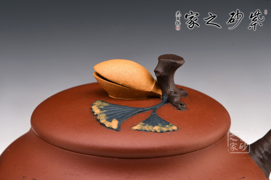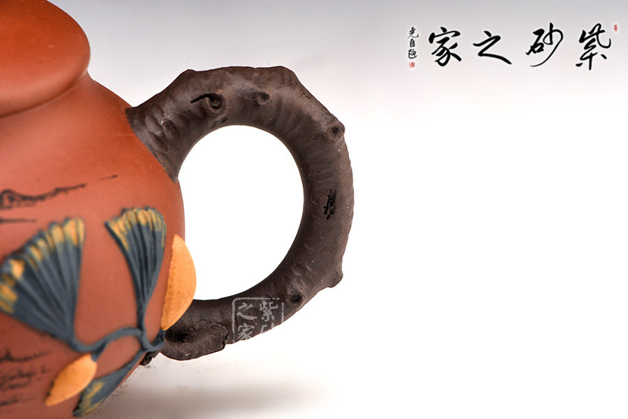 作品整體圓潤(rùn),稍扁圓壺,壺腹豐腴,穩(wěn)重大方。壓蓋與整壺融為一體,緊密留茗香。嘴、把、鈕均呈樹枝形狀,雙色泥工藝,鈕把處還新長(zhǎng)出有新葉嫩果,黃綠相間,自然和諧之態(tài),別具美感,體現(xiàn)了作者深厚的裝飾工藝及藝術(shù)欣賞性。