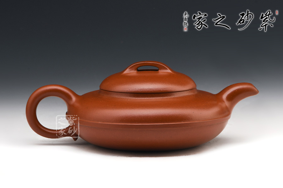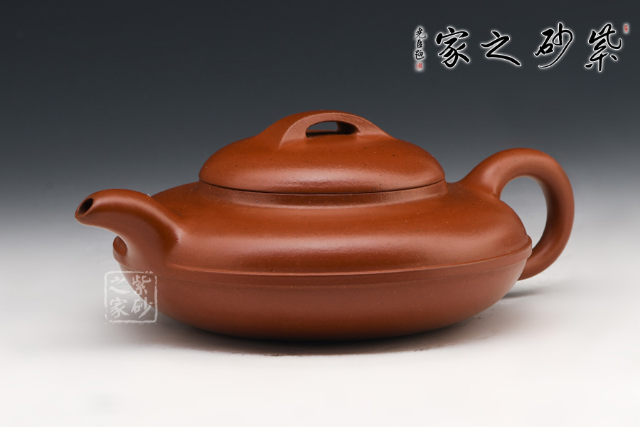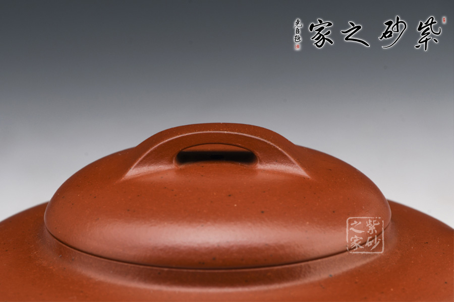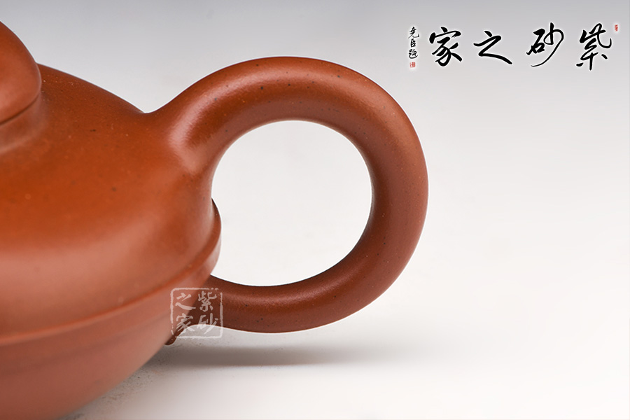 此壺式為四十年代所興起,歷經(jīng)幾代藝人演變,時趨成熟。壺身用兩泥片合制作成扁球狀,口部與半球狀蓋相切,壺底簡潔,為一捺底,橋梁鈕與蓋渾然一體,整個壺在扁圓中求韻味。流自壺腹胥伸自然,把高挑圓潤下留垂耳,與流對應稱勢。中置一腰帶線將全壺提攜神韻,腰線帶方、角圓,變化中求統(tǒng)一,將制作中的泥痕藏于其中,達到天衣無縫。