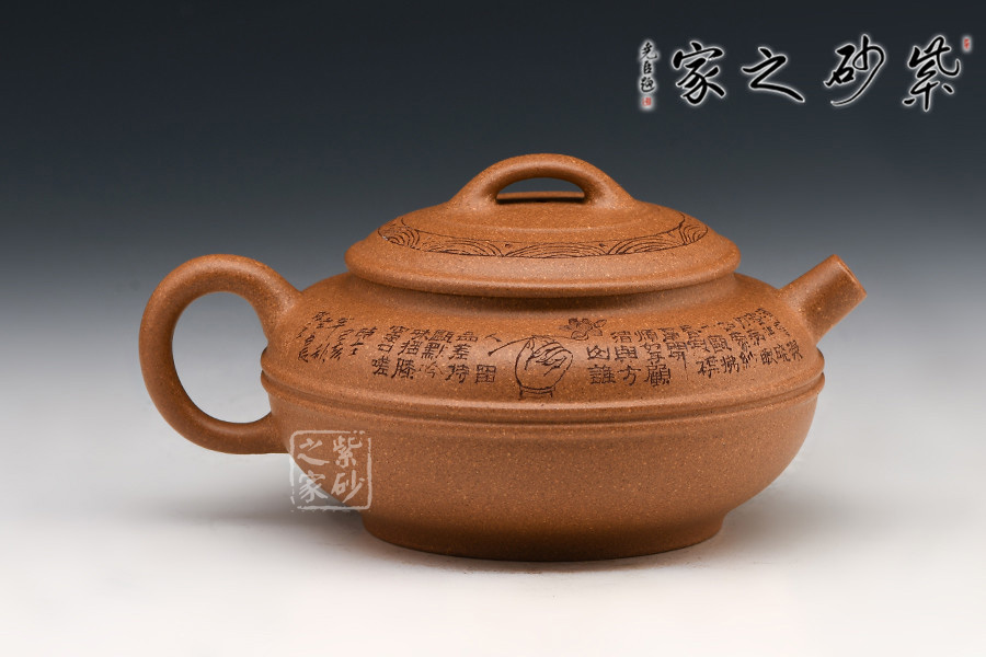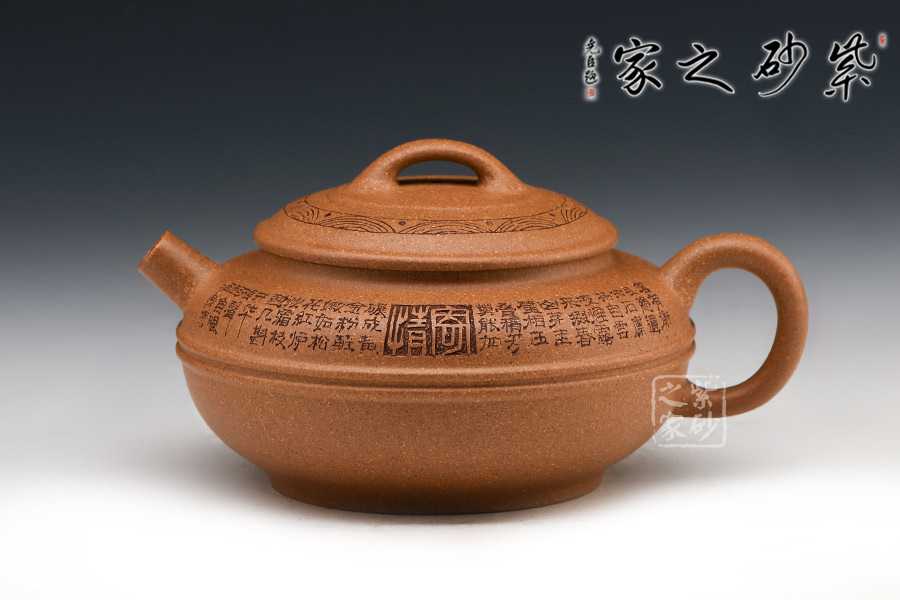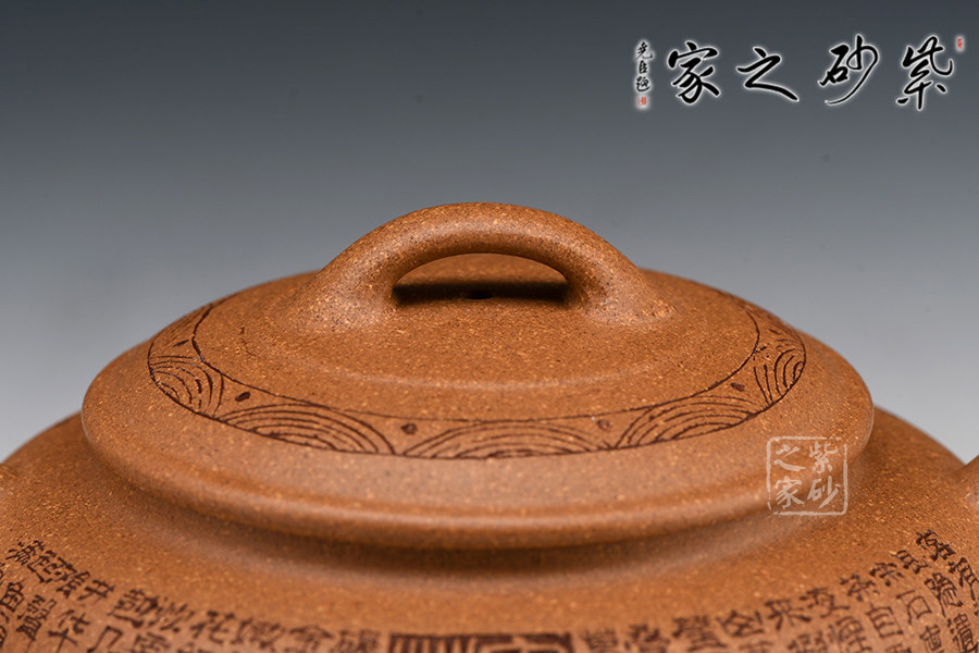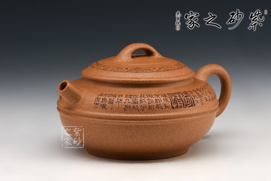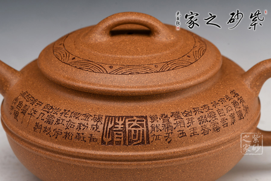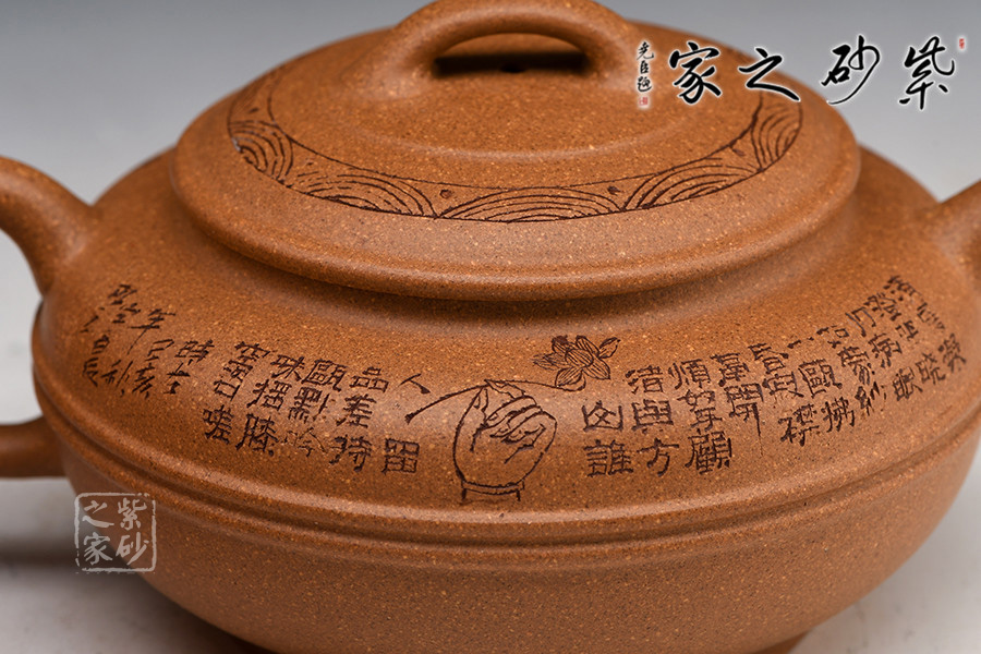 線圓為晚清民國經(jīng)典壺式之一,此壺身用兩泥片合成扁球狀,壺底簡潔,整個壺在扁圓中富于韻味。短直流自壺腹伸出,把高挑圓潤呈耳形,與流對應(yīng)稱勢。中置雙腰帶線將全壺提攜神韻,此壺制作極富有張力,加之通身的詩詞刻繪及蓋面上的花紋裝飾,氣韻十足。