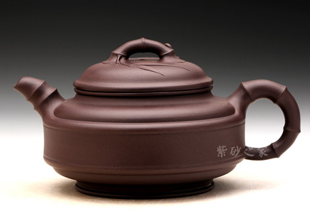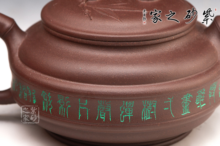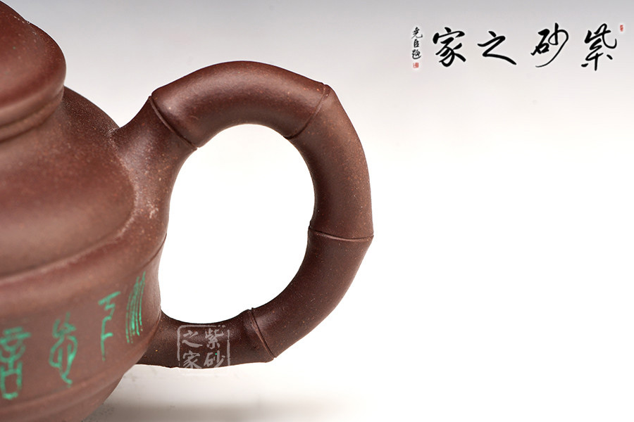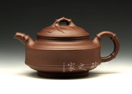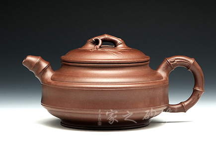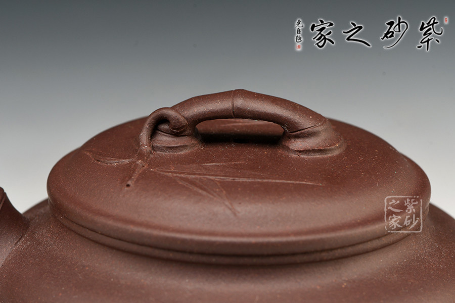 該壺底為盤狀,竹形鼓身,壺身雙線,飽滿有力。凹肩,長頸,口蓋子母線,虛蓋相配;一彎嘴,圓把,橋梁鈕,均塑以竹節(jié),蓋上貼飾竹葉,竹節(jié)剛勁挺拔,竹葉俊秀飄逸。