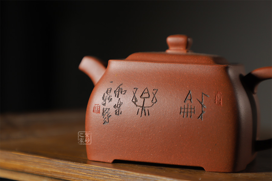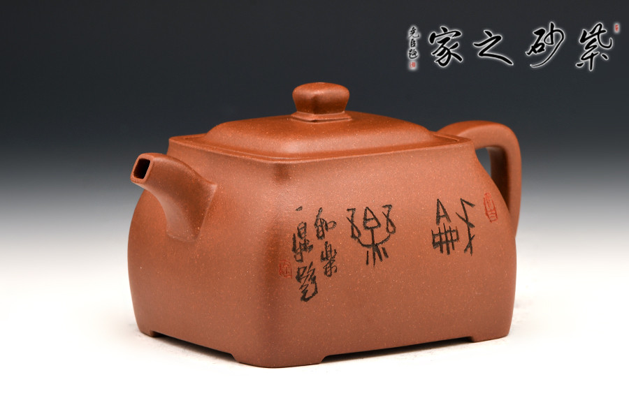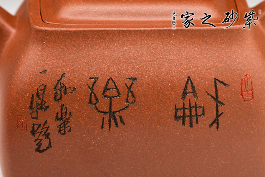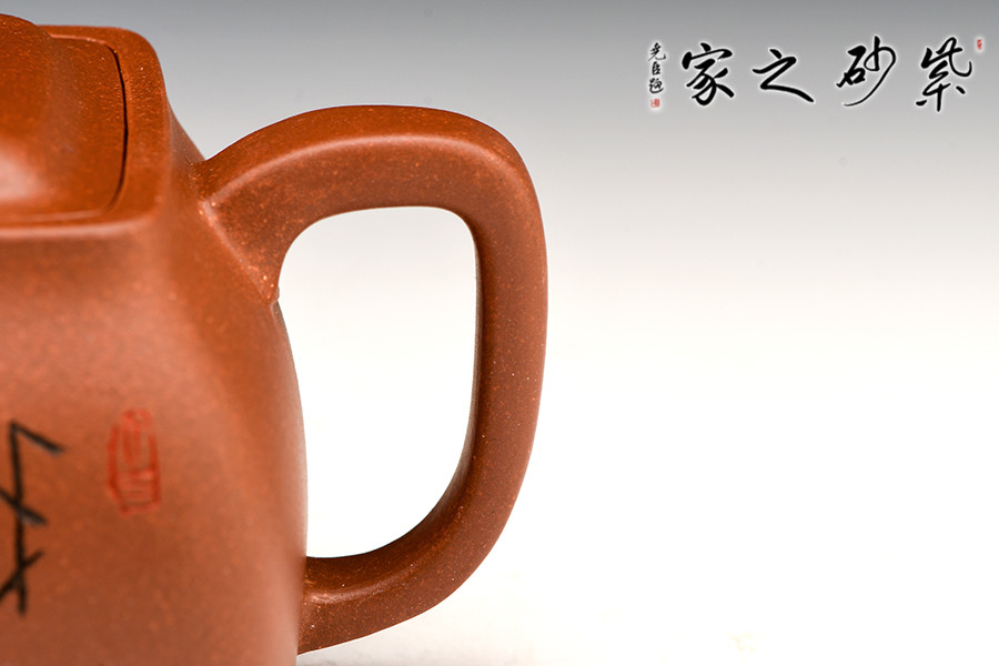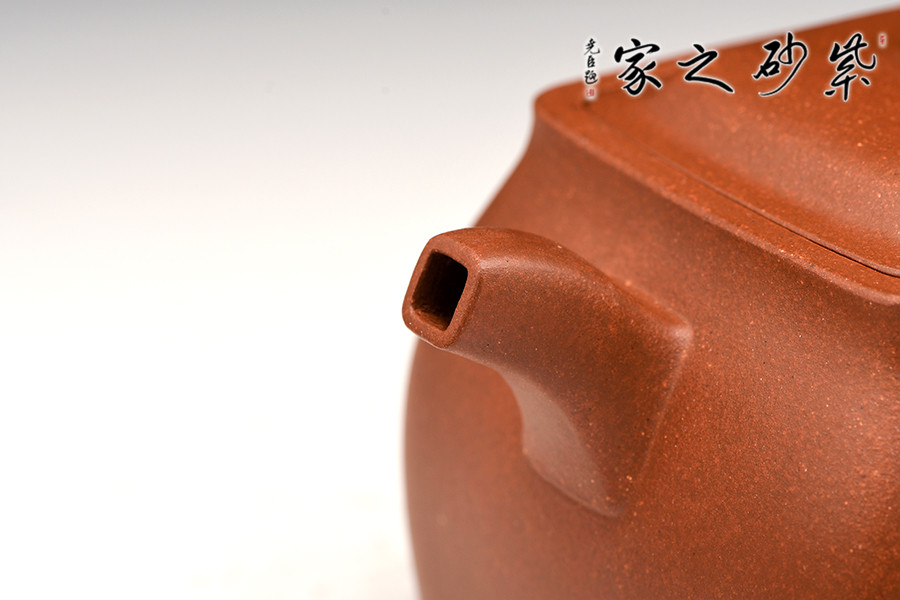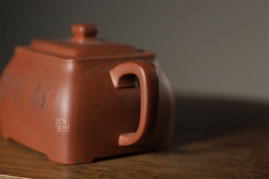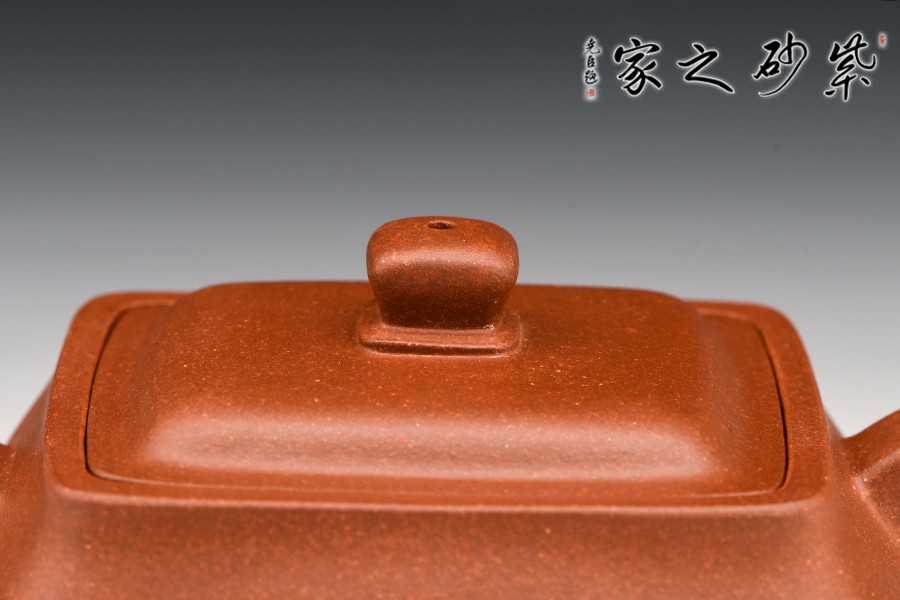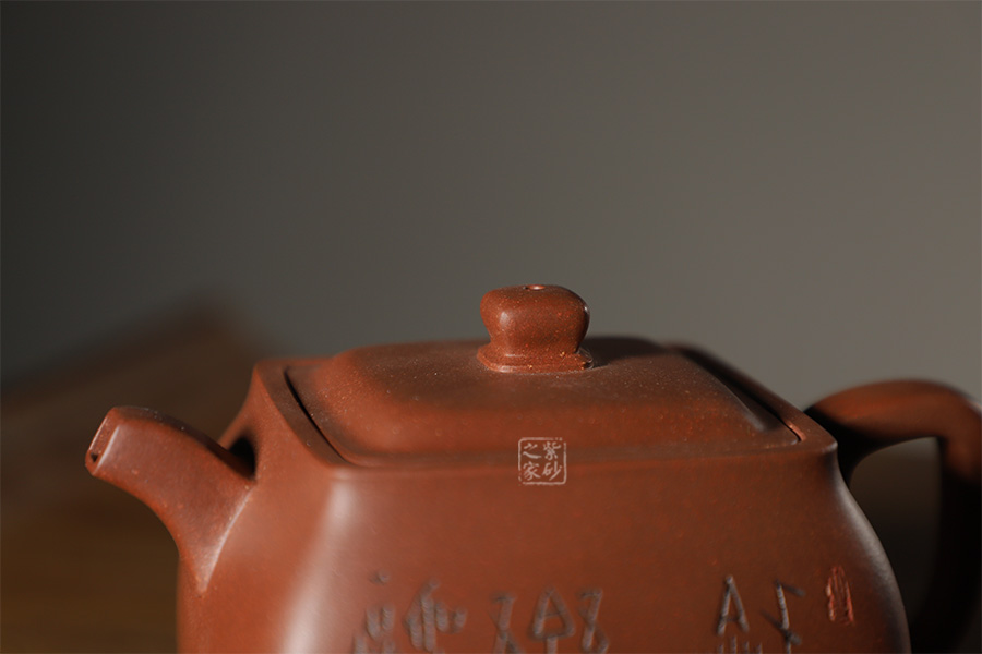 此壺色澤雅致,砂質隱現(xiàn),造型寓圓于方,敦實厚重。彎曲流,環(huán)形把手,平底呈四方足,制作精細,質樸大方,結構合理,用功獨到。蓋面鼓出,嵌蓋,密縫緊湊,鈕形與壺身形制相若。