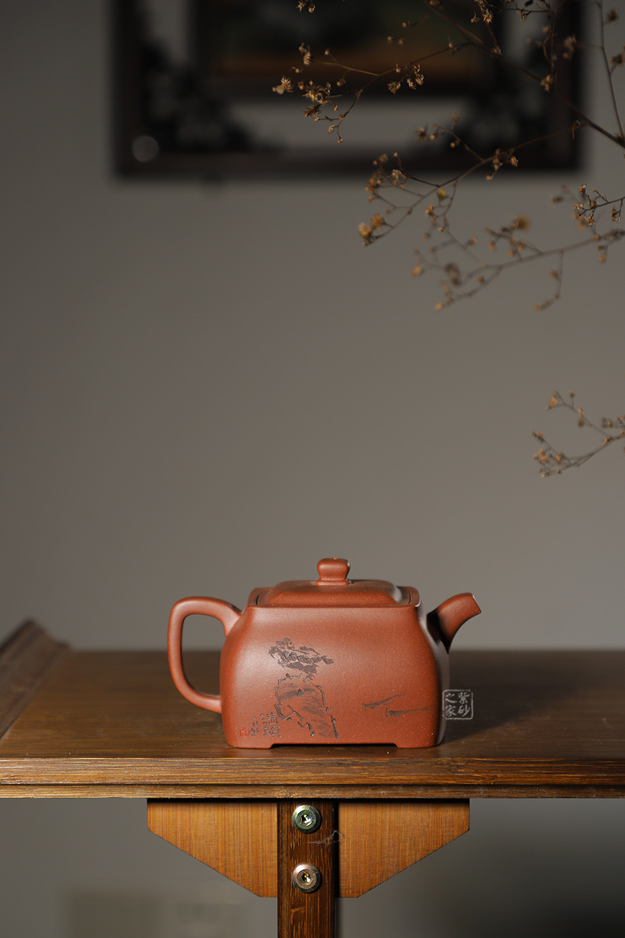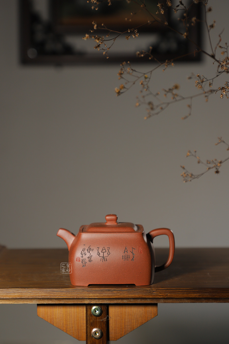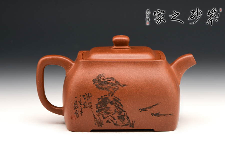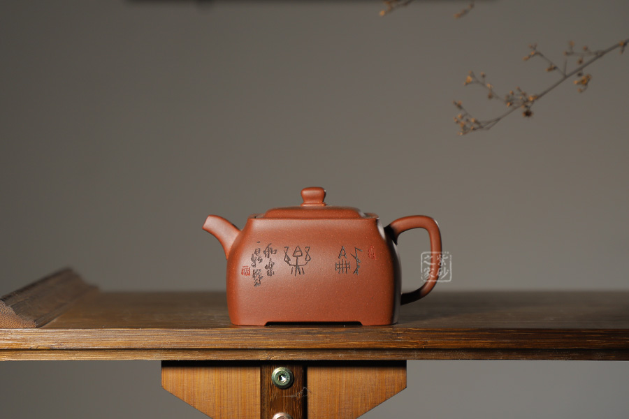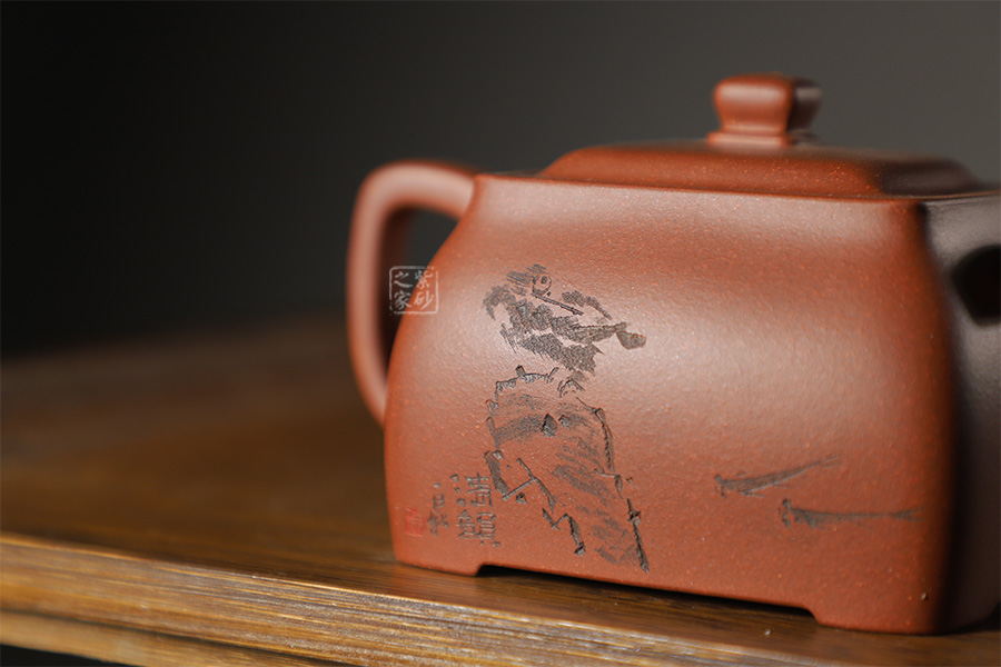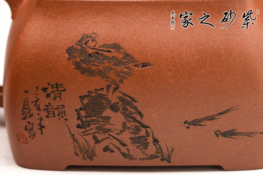 此壺色澤雅致,砂質隱現(xiàn),造型寓圓于方,敦實厚重。彎曲流,環(huán)形把手,平底呈四方足,制作精細,質樸大方,結構合理,用功獨到。蓋面鼓出,嵌蓋,密縫緊湊,鈕形與壺身形制相若。