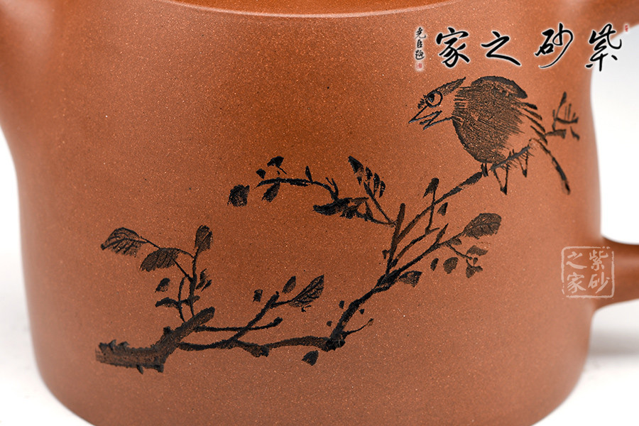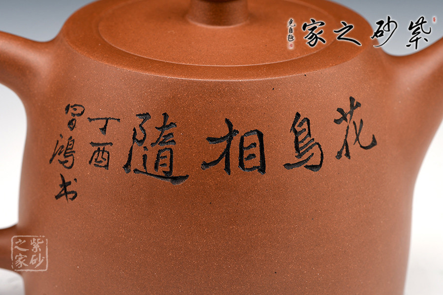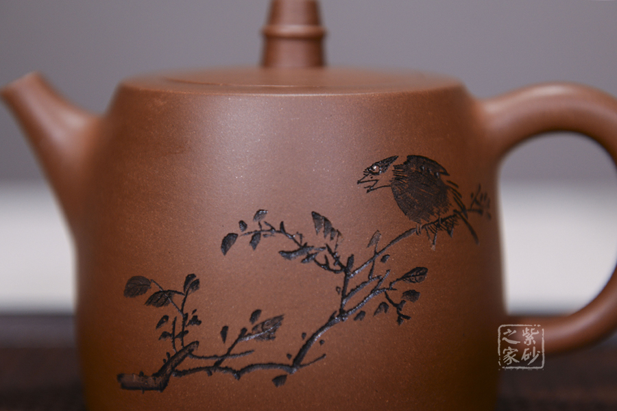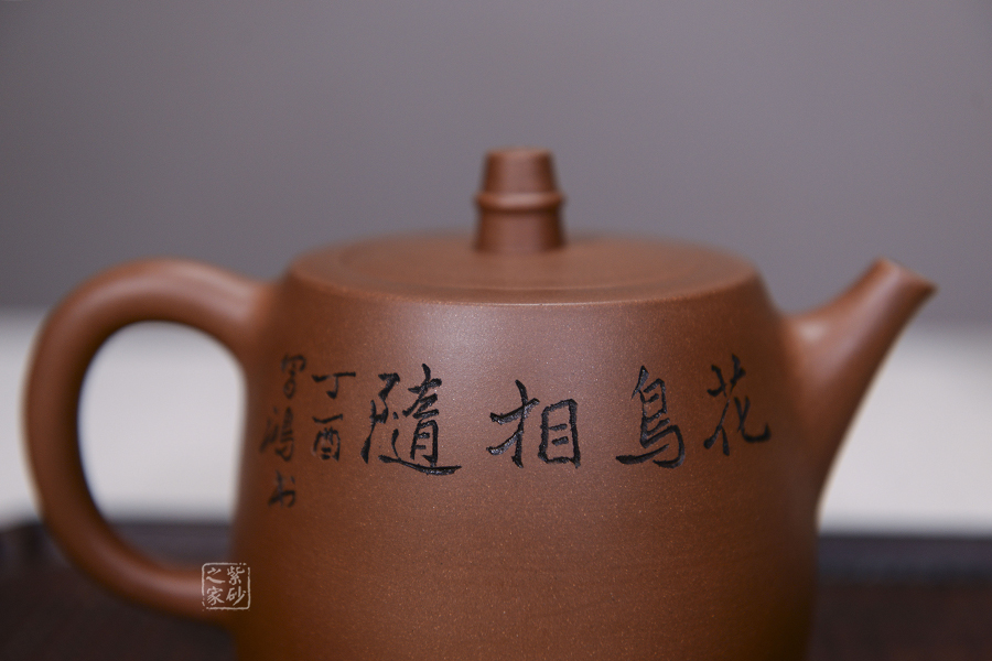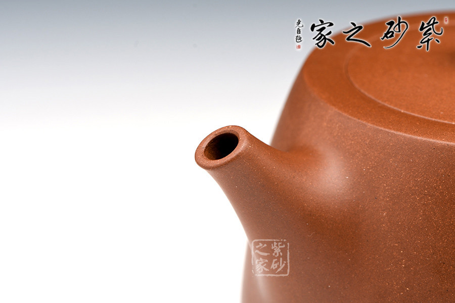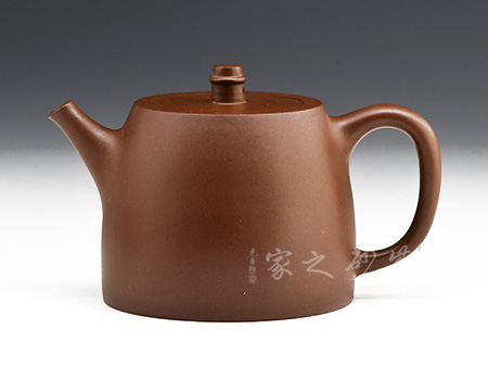 造型規(guī)整,壺身如鐘,氣勢(shì)浩然。平嵌蓋,與壺融為一體。柱鈕上部置圈線,流直口平,耳把似方,形筒古樸。整器亦樸亦雅,亦古亦今,體現(xiàn)了楊老師對(duì)紫砂壺的美學(xué)追求。