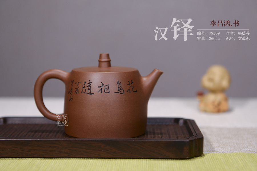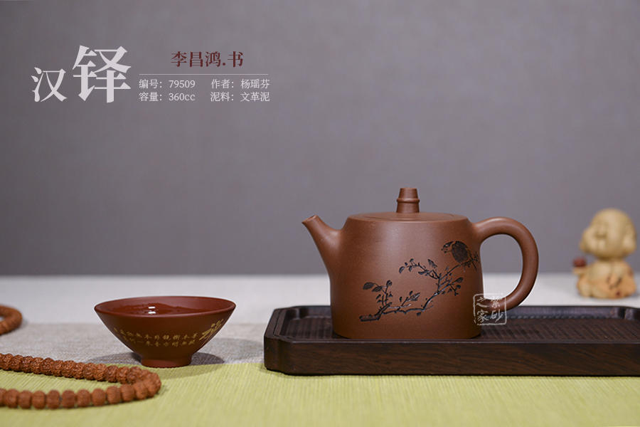 《漢鐸壺》,典出“以漢之鐸,為今之壺,土既代金,茶當(dāng)呼荼”。此壺泥質(zhì)溫潤(rùn),壺泥配制亦頗為講究,質(zhì)堅(jiān)砂勻,粗而不糙。