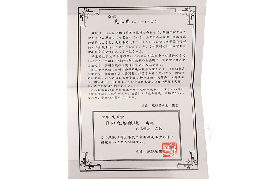 產(chǎn)地:京都 堂口:光玉堂 材質(zhì):生鐵 工藝:砂鑄 容量:1350cc 重量:1467g