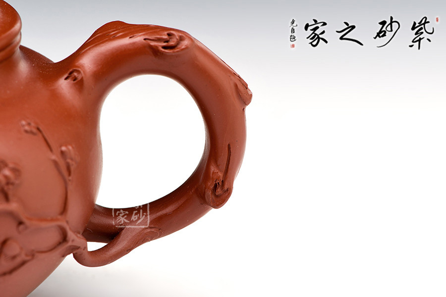 此壺壺體呈“心”形,從傳統(tǒng)壺式演化而來,壺口與壺底收小,壺腹鼓圓,線條修長,造型難度大。攀梅花枝梗做嘴、把、鈕,枝與節(jié)疤布置合理,伸展自然,老干新枝,爭奇斗艷。