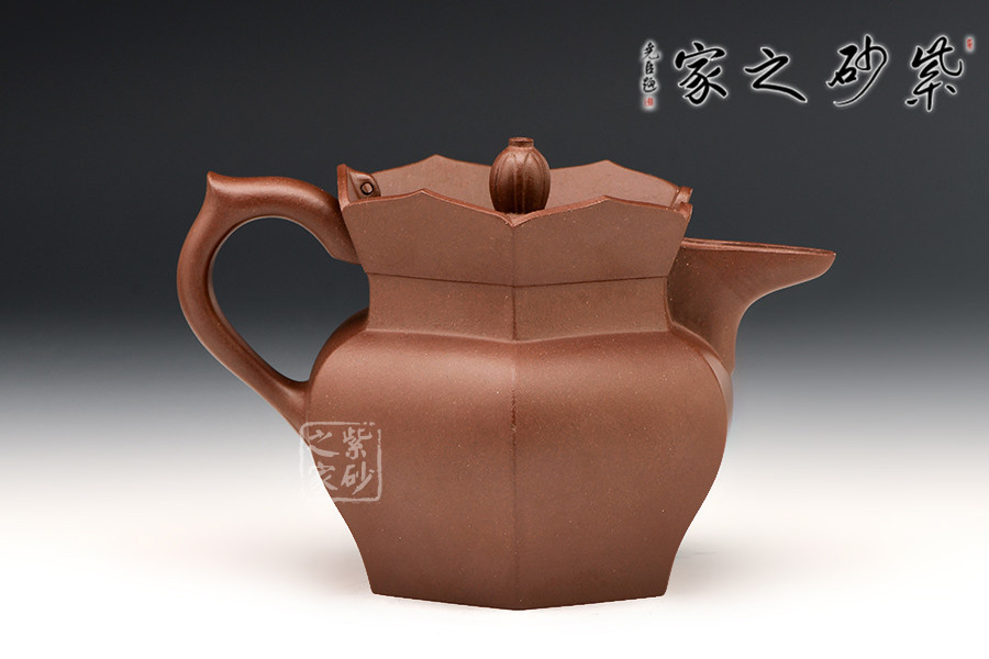 僧帽壺遠(yuǎn)觀似一飽滿壯美之冠帽,其壺身作六角形僧帽,從壺蓋開始,整個(gè)壺體分成六等分,寓意六時(shí)吉祥,壺冠蓮花分成五瓣,寓意五方五佛。而第六瓣則改為流,如同一鴨嘴出水孔居于上,增加趣味性。平帶形的壺鋬?cè)趬亓髦畬?duì)側(cè),鋬上部彎有一按指位,增強(qiáng)了提拿倒水之實(shí)用性。
