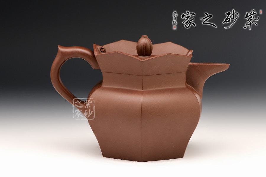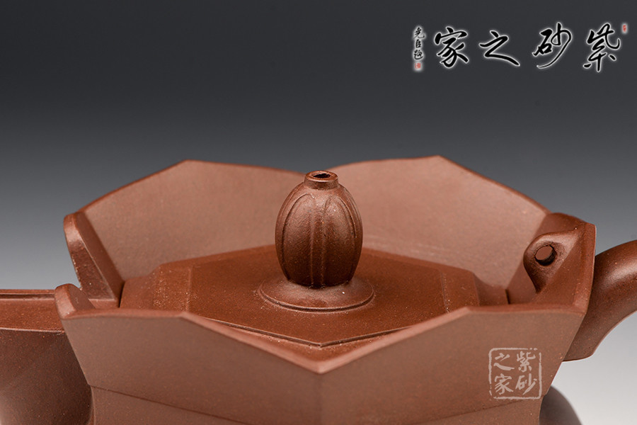壺腹弧度婉轉(zhuǎn)自然,蓮瓣狀矮墻圍繞成帽檐狀,以六方形壺蓋為中心相互銜接,各個部分的銜接自然貼切、和諧挺刮,造型上節(jié)奏緊湊、渾然一體。