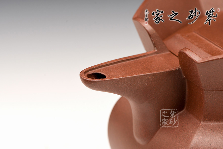 壺把中間有一凸起作為點綴,壺嘴更具特色,如同一鴨嘴,出水孔居于上,增加趣味性。壺的整體線面挺括平正,輪廓線條分明,美感十足。