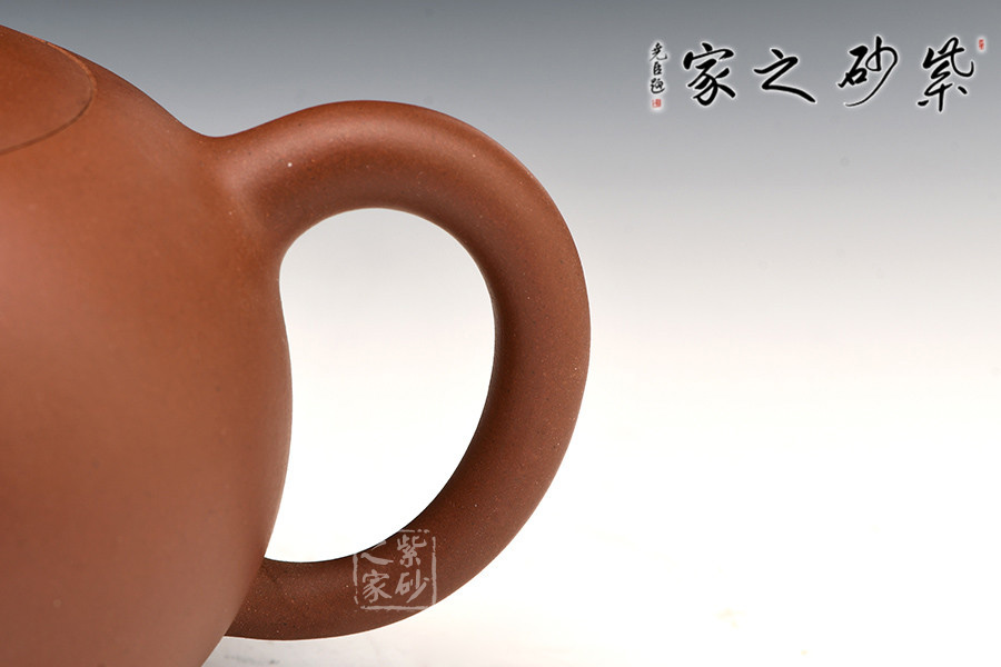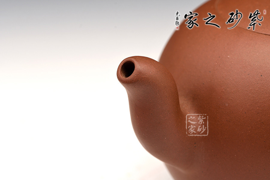 整款壺圓中稍扁,豐腴飽滿,給人親和貼近之感。尤其是細膩的砂質(zhì),更添幾分女性特有的柔美,把玩在手,如同和一膚若凝脂的美女親近,只可意會不可言傳。