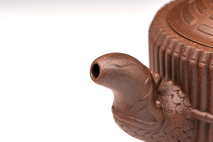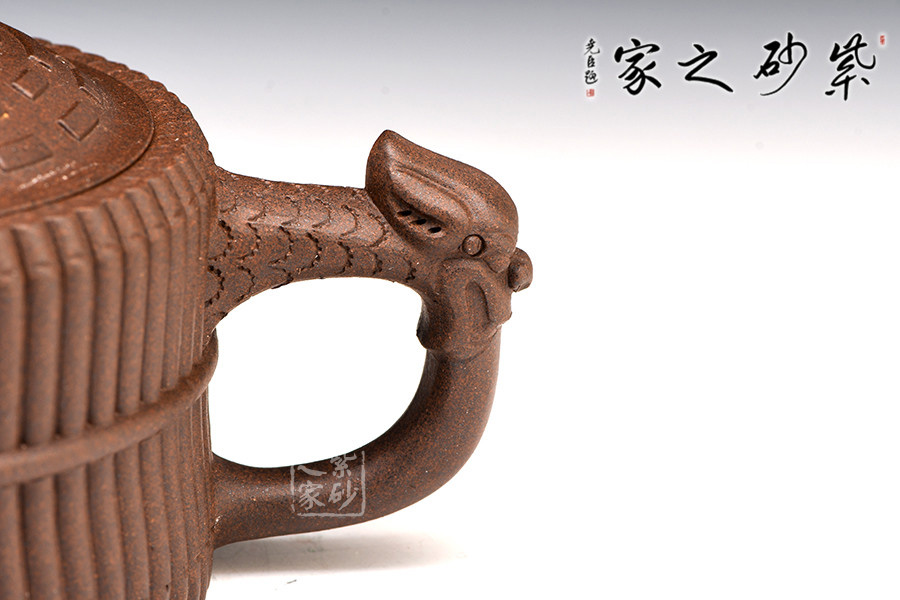初觀此壺,有龍有竹,有卦有圖,富中華文化之內(nèi)涵。此壺俗稱“龍頭一捆竹壺”,亦名有“龍頭八卦一捆竹壺”、“八卦河圖洛書龍頭一捆竹壺”、“飛龍八卦壺”等,此器型最早可見于清代名手邵大亨傳器。此器展現(xiàn)了深邃的中華文化之哲思,是抽象與具象的完美統(tǒng)一。