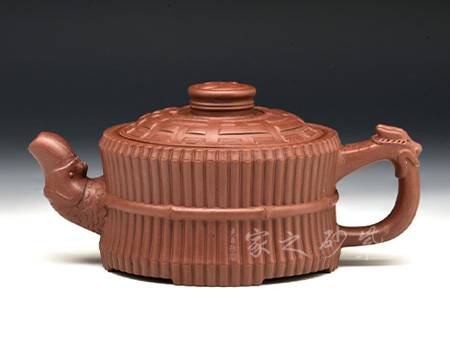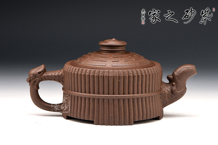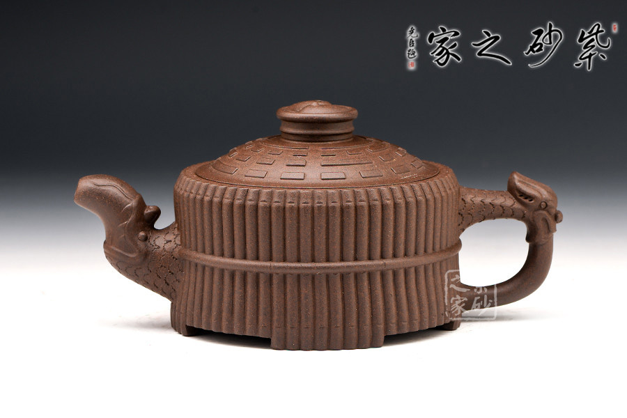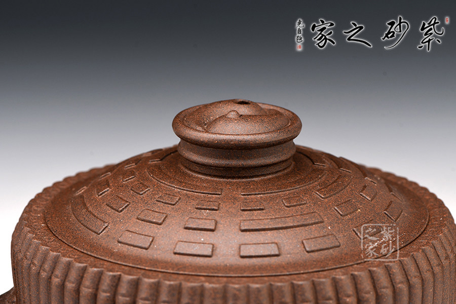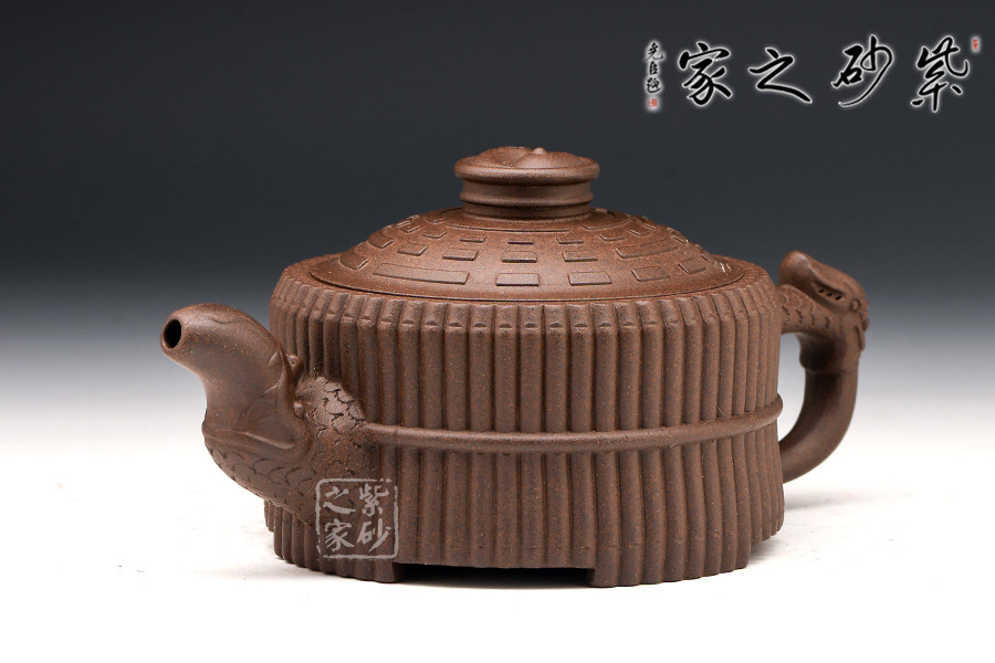 此壺色澤嫣紫沉樸,壺表隱現(xiàn)珠光,紫潤(rùn)可愛。壺身外壁似一捆整齊的竹段,中腰以一竹束之。竹段由64根竹子均齊排列,分四組重合,壺底四周有四個(gè)腹部伸出的8根竹子做足,上下一體,縝密協(xié)調(diào)。束腰之竹鏤刻精致,64根竹的上端均刻有小圓圈,以示竹心中空。壺蓋微凸作伏羲八卦方位圖,蓋紐為太極圖式。把和流以堆雕飾成飛龍形象,龍口含水左右呼應(yīng),似有“見龍?jiān)谔铩敝?。曲與方均勢(shì)平衡,口蓋配合絲嚴(yán)合縫,四腳平穩(wěn)嚴(yán)謹(jǐn)縝密。