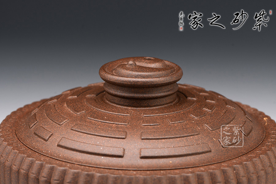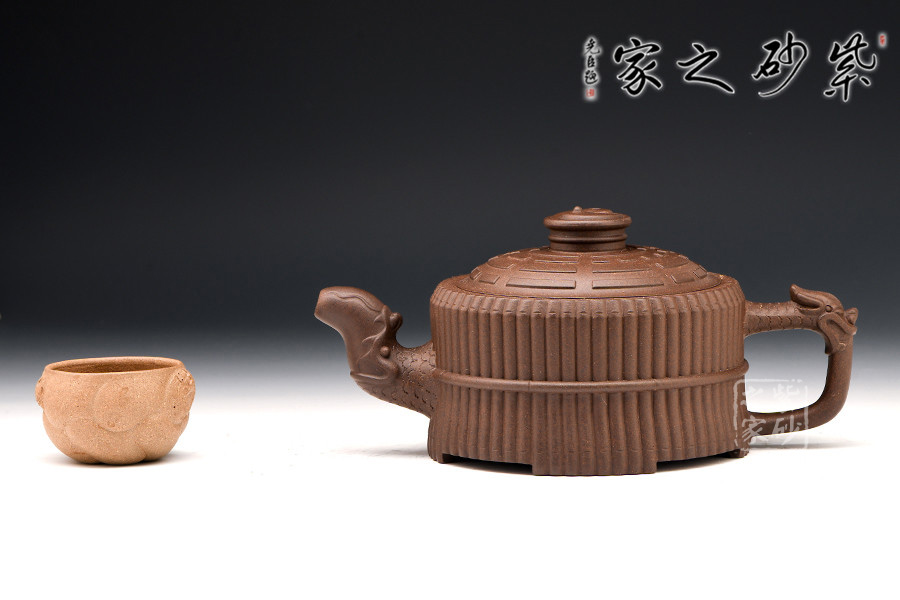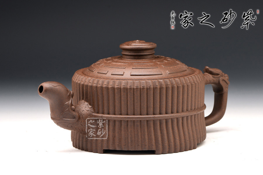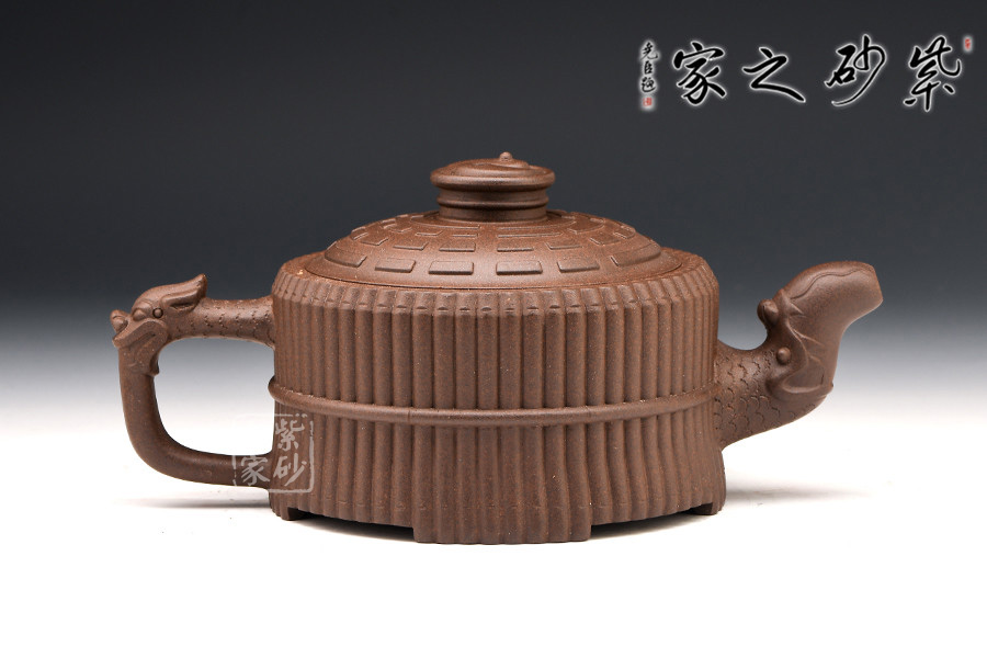 此壺色澤嫣紫沉樸,壺表隱現(xiàn)珠光,紫潤可愛。壺身外壁似一捆整齊的竹段,中腰以一竹束之。竹段由64根竹子均齊排列,分四組重合,壺底四周有四個腹部伸出的8根竹子做足,上下一體,縝密協(xié)調(diào)。束腰之竹鏤刻精致,64根竹的上端均刻有小圓圈,以示竹心中空。壺蓋微凸作伏羲八卦方位圖,蓋紐為太極圖式。把和流以堆雕飾成飛龍形象,龍口含水左右呼應(yīng),似有“見龍在田”之意。曲與方均勢平衡,口蓋配合絲嚴(yán)合縫,四腳平穩(wěn)嚴(yán)謹(jǐn)縝密。
