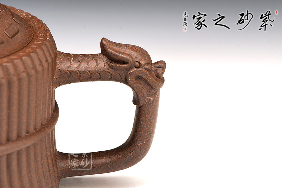 初觀此壺,有龍有竹,有卦有圖,富中華文化之內(nèi)涵。此壺俗稱“龍頭一捆竹壺”,亦名有“龍頭八卦一捆竹壺”、“八卦河圖洛書龍頭一捆竹壺”、“飛龍八卦壺”等,此器型最早可見于清代名手邵大亨傳器。此器展現(xiàn)了深邃的中華文化之哲思,是抽象與具象的完美統(tǒng)一。