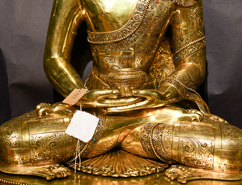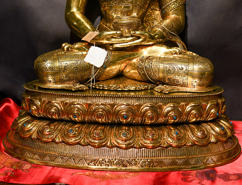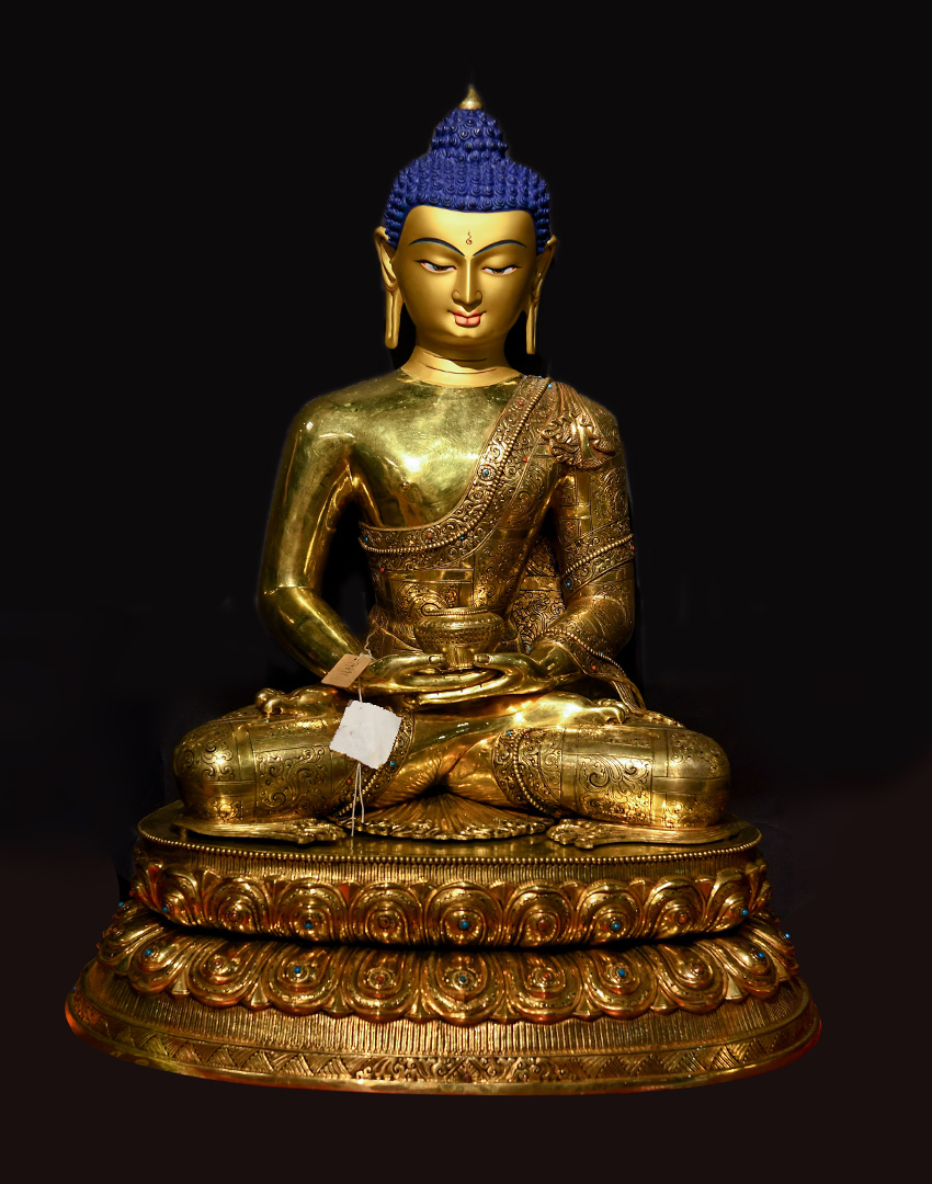 此尊佛像為尼泊爾精品紫銅鎏金手工佛像,高度為64CM,眼觀鼻,鼻觀心,開臉非常殊勝。
