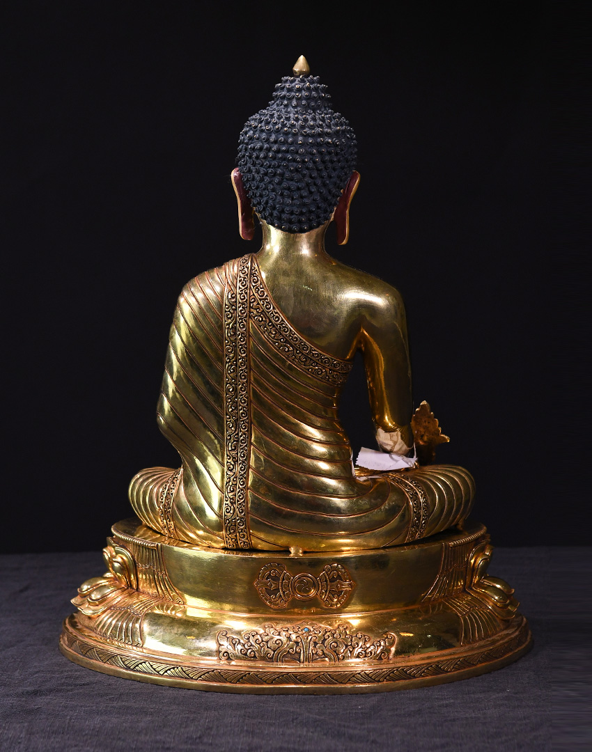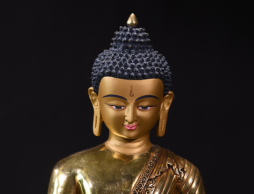 此尊佛像為尼泊爾精品紫銅鎏金手工佛像,高度為45CM,眼觀鼻,鼻觀心,開臉非常殊勝。